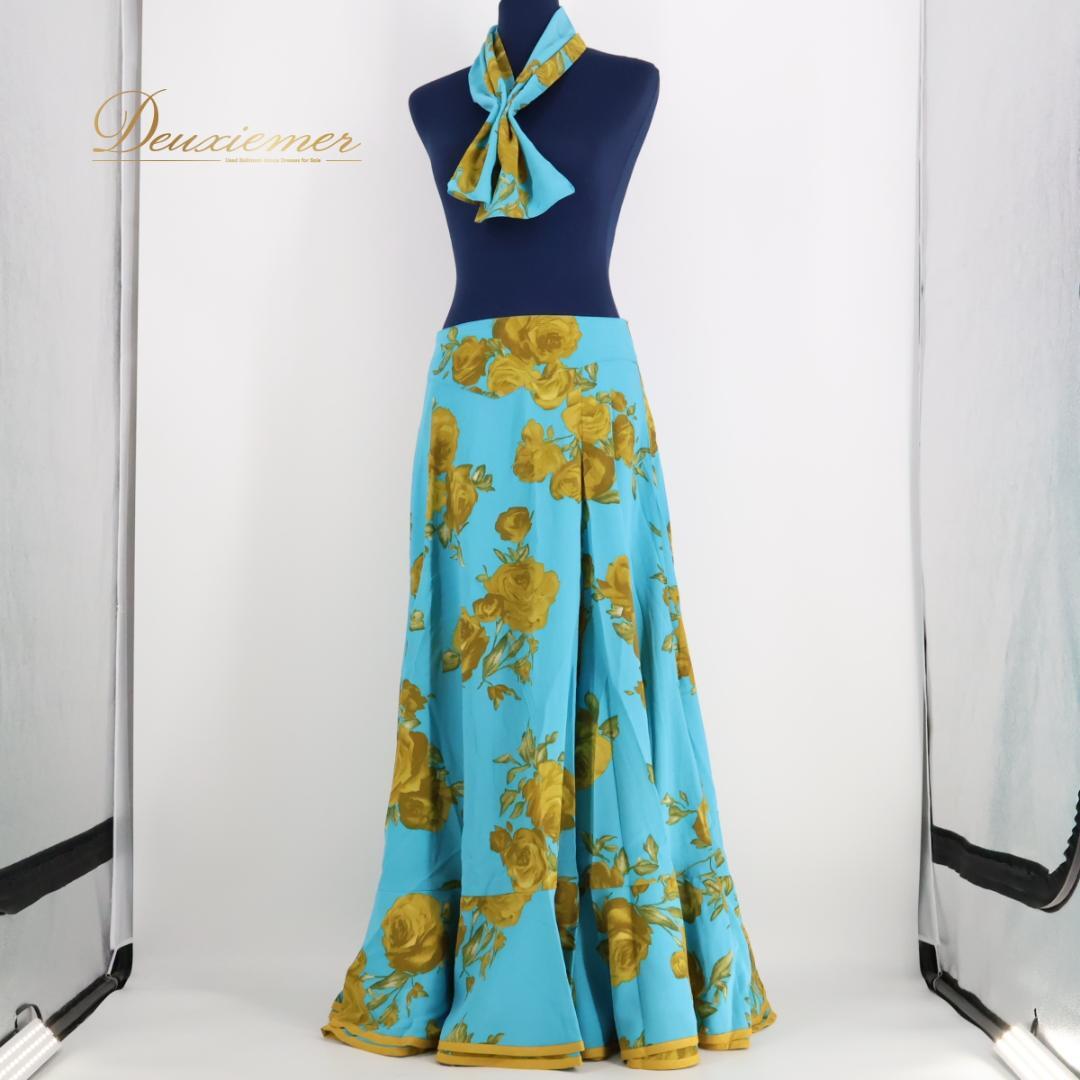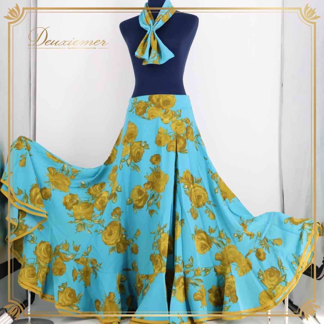 【美品 フラメンコ衣装】ブルー アルマフラメンカ ファルダ ボウタイ スカート 青 花柄 マスタード 水色 軽い 薄い 長い