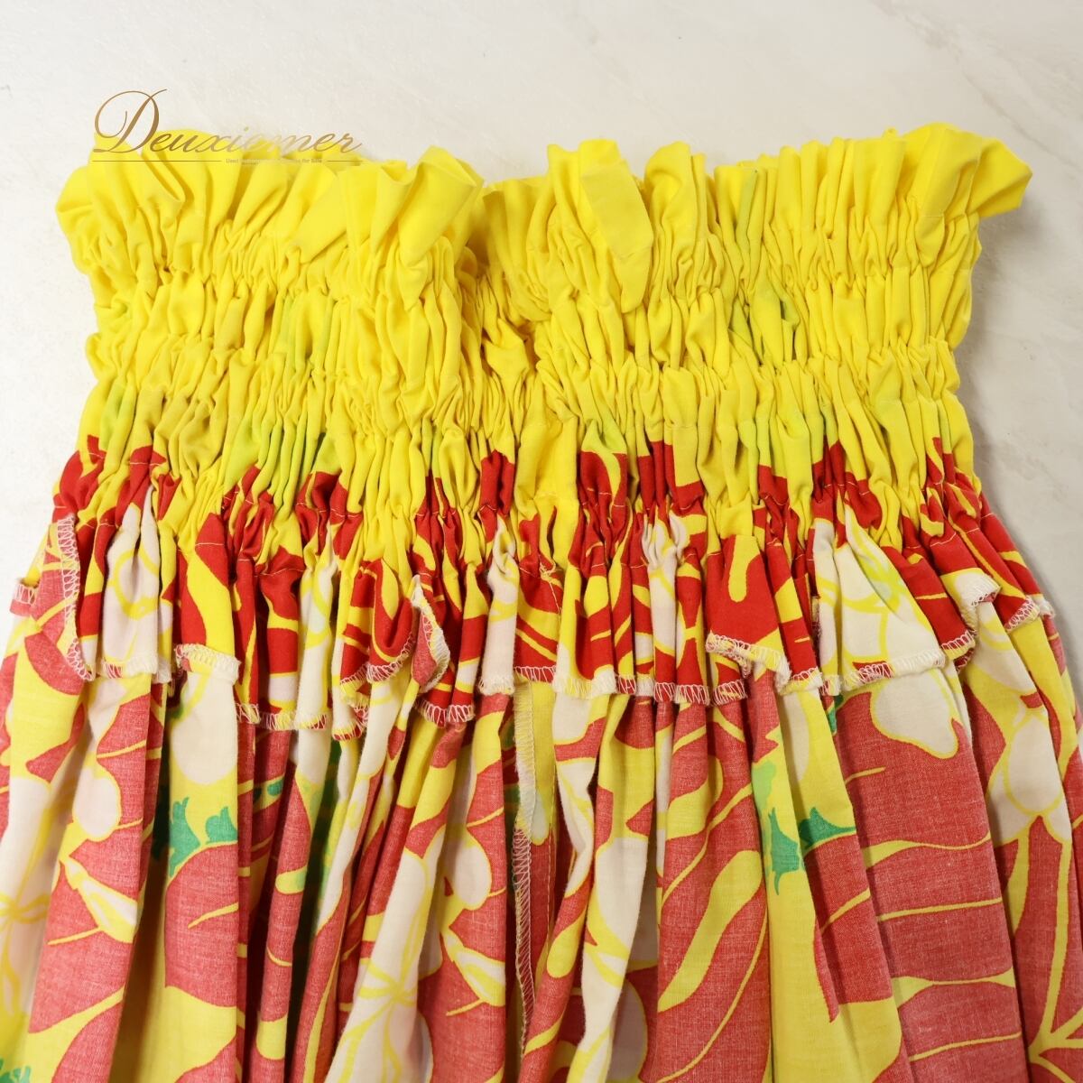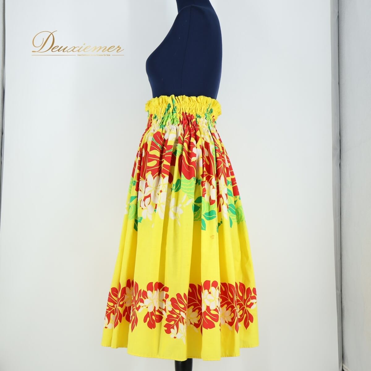 #フラダンス #パウスカート #プルメリア柄 #イエロースカート #花柄スカート #ハワイアンファッション #鮮やかカラー #明るいデザイン #ホワイトアクセント #レッドポイント #グリーンアクセント #南国スタイル #かわいいスカート #ハワイアン衣装 #リゾートファッション #華やかスタイル #黄スカート #赤アクセント #ダンス衣装 #ダンスコスチューム #ステージ衣装 #古着 #中古 #ENUTSU