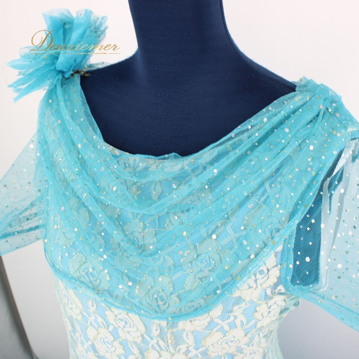 【美品 社交ダンス衣装】ワンピース ドレス ICHIOKU イチオク ライトブルー 水色 フロート コサージュ 花柄 レース ゴージャス