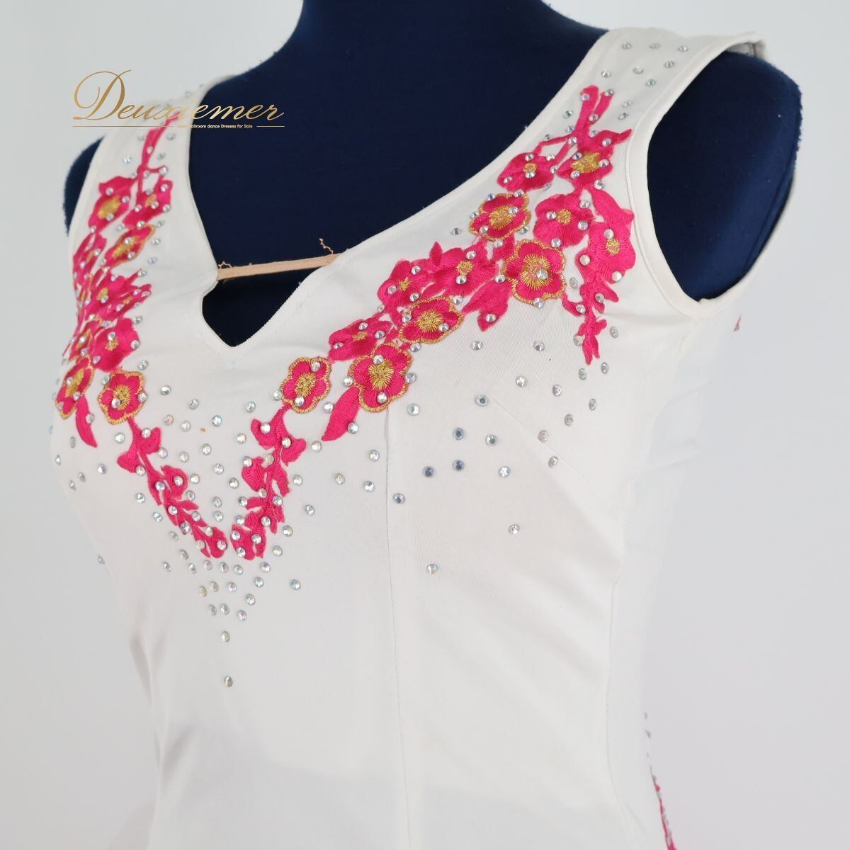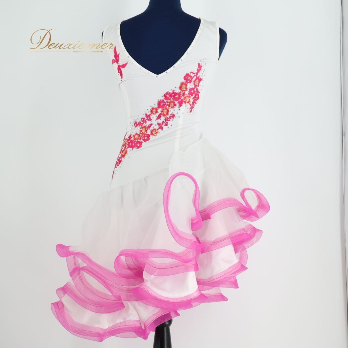 【社交ダンス衣装】ホワイト ラテン ドレス ワンピース 白 ピンク フリル レース デモ 競技用 花 ダンス用 軽い パーティ