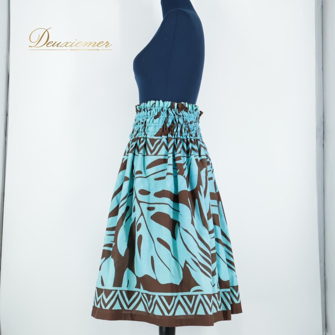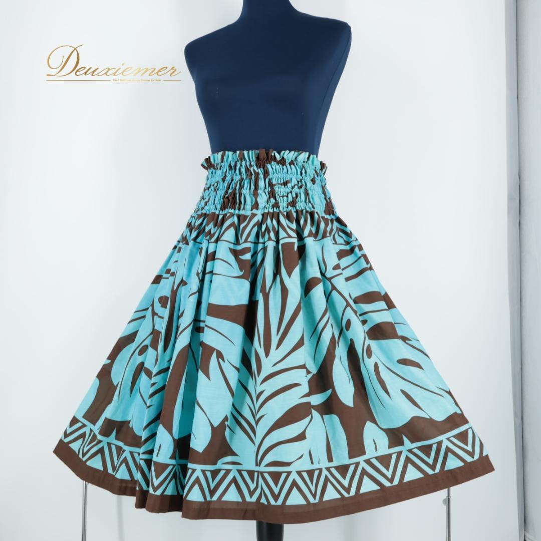 【フラダンス衣装】ブラウン パウスカート 茶 水色 スカイブルー モンステラ柄 鮮やか 華やか ハワイアン アロハ 可愛い ゴム