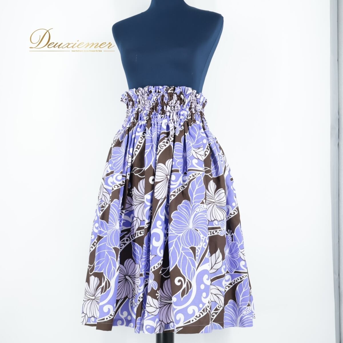 【美品 日本製 フラダンス衣装】ブラウン ハレハワイイ パウスカート 茶 紫 白 ハイビスカス柄 パープル ホワイト かわいい 花