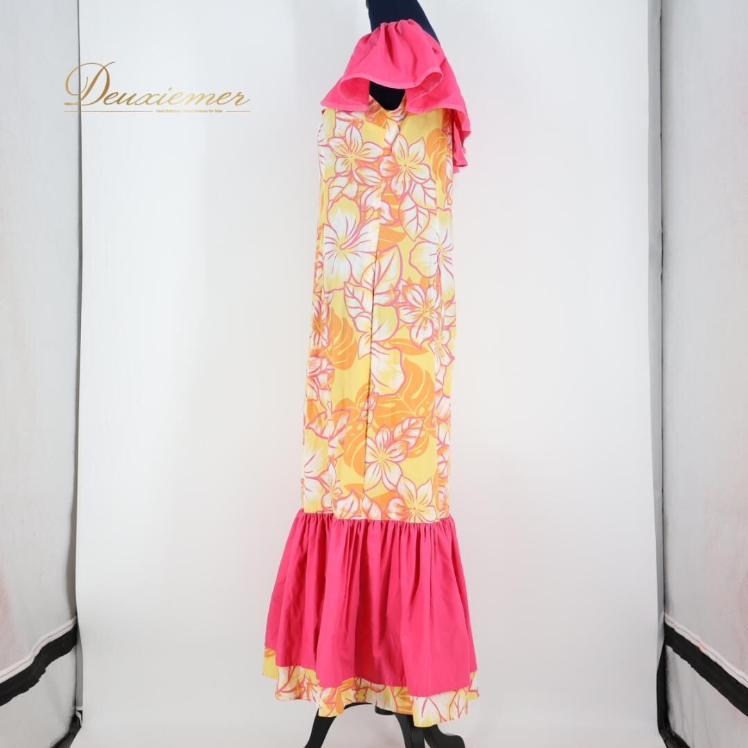 【フラダンス衣装】イエロー ワンピース ドレス 黄 ピンク オレンジ ハイビスカス柄 花柄 フリル イエロー ふんわり かわいい