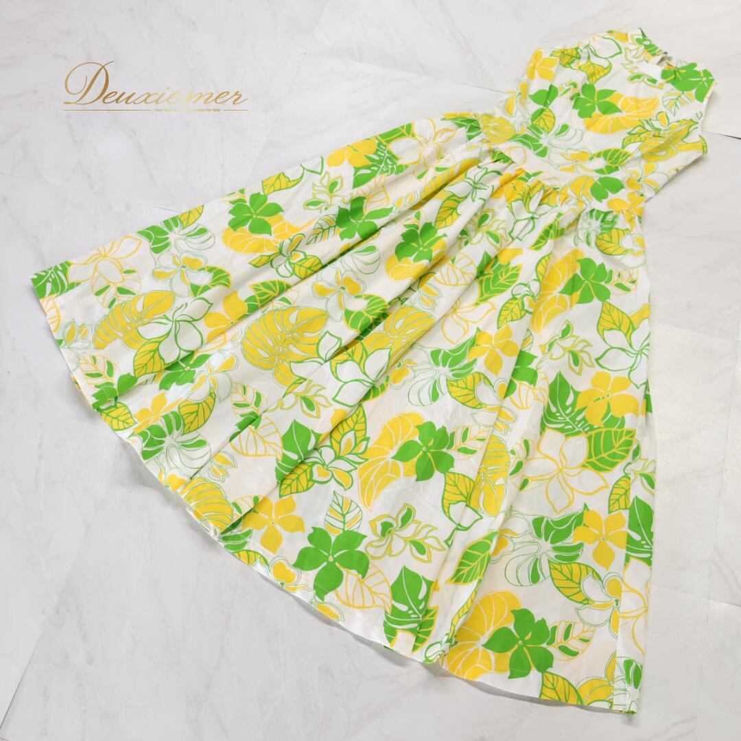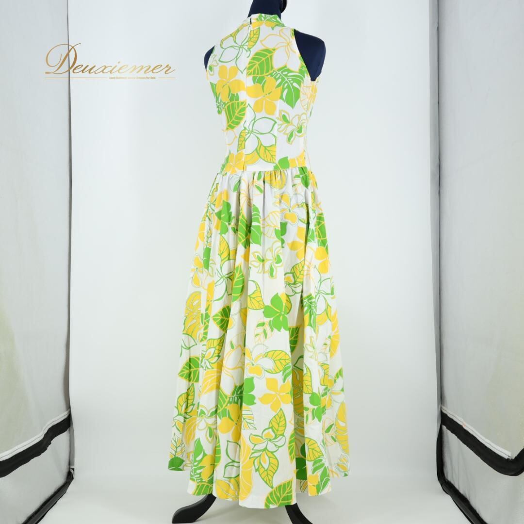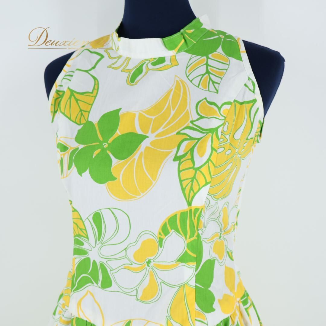 【フラダンス衣装】ホワイト ワンピース ドレス 白 黄 黄緑 イエロー モンステラ柄 花柄 爽やか ノースリーブ 袖なし かわいい