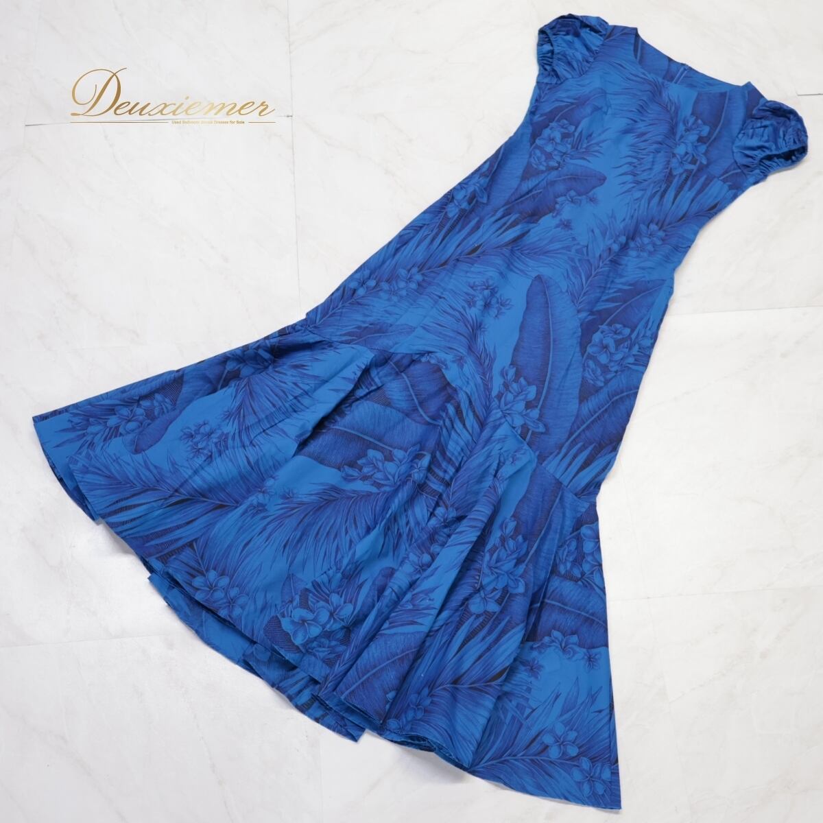 【フラダンス衣装】ブルー ワンピース ドレス 青 プルメリア柄 花柄 華やか ハワイアン アロハ ふんわり パフスリーブ 可愛い