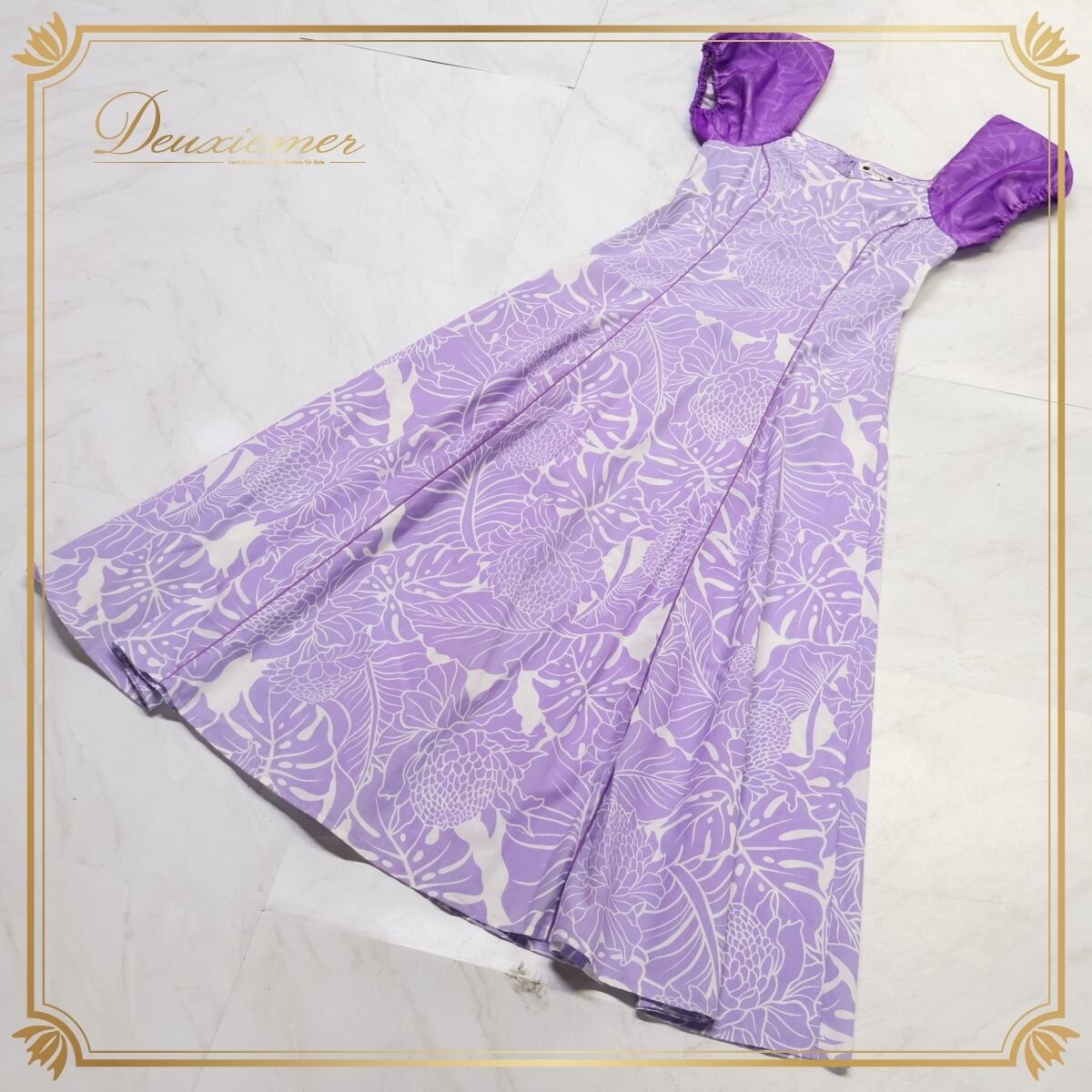 #フラダンス #衣装 #ワンピース #ドレス #日本製 #パンドール #パープル #ホワイト #モンステラ #華やか #サイズ4 #ファスナー #おしゃれ #爽やか #ダンス衣装 #お祭り #イベント #コスチューム #春夏ファッション #ENUTSU