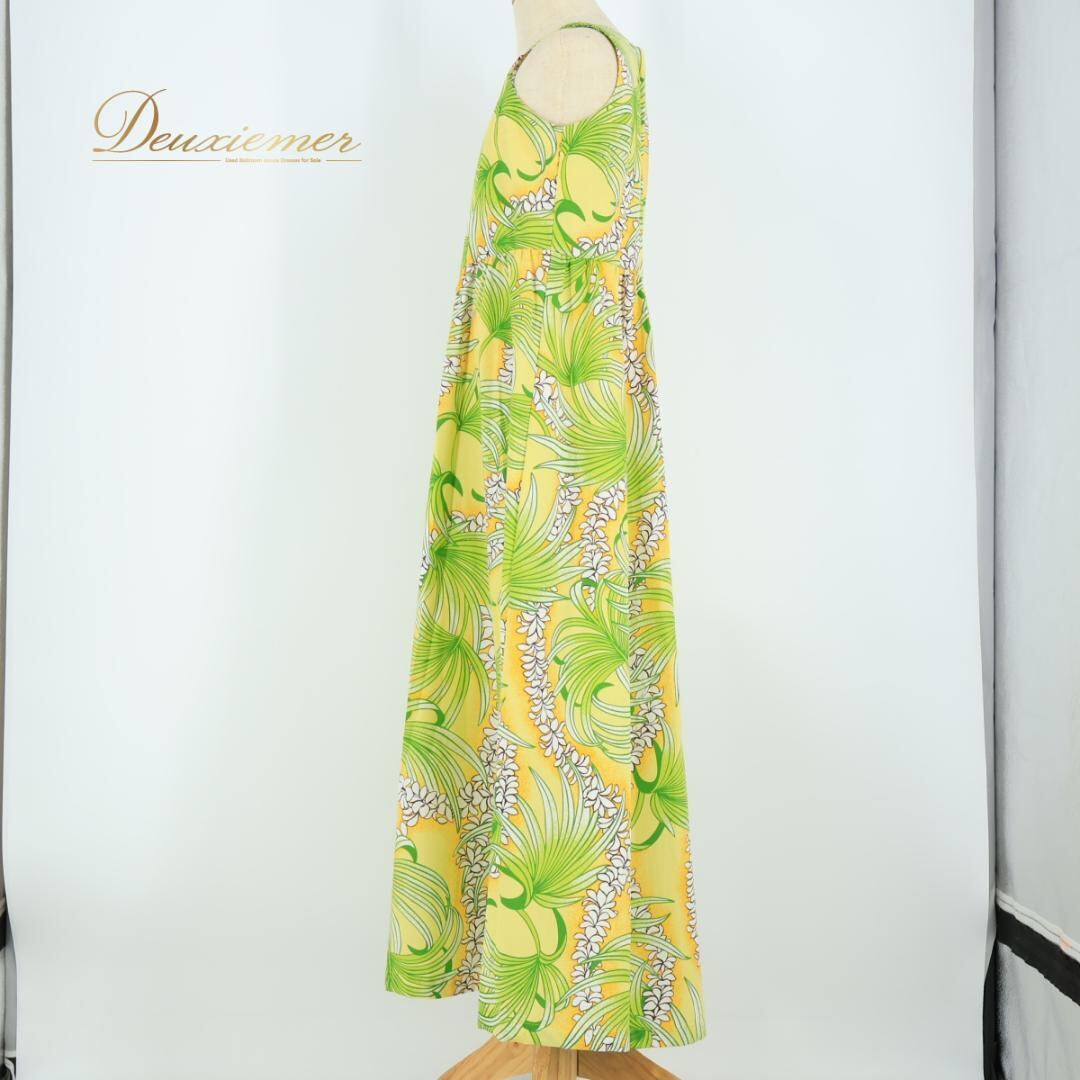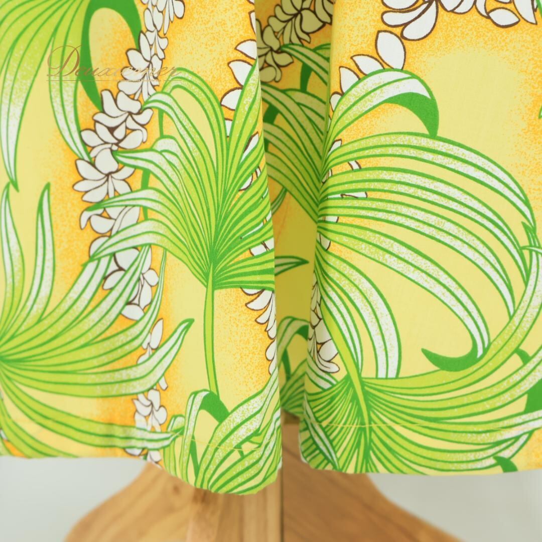 【ジュニアサイズ用 美品 ハワイ製 フラダンス衣装】イエロー Laula ワンピース ドレス 黄 緑 白 マイレ柄 花柄 ケイキ 可愛い