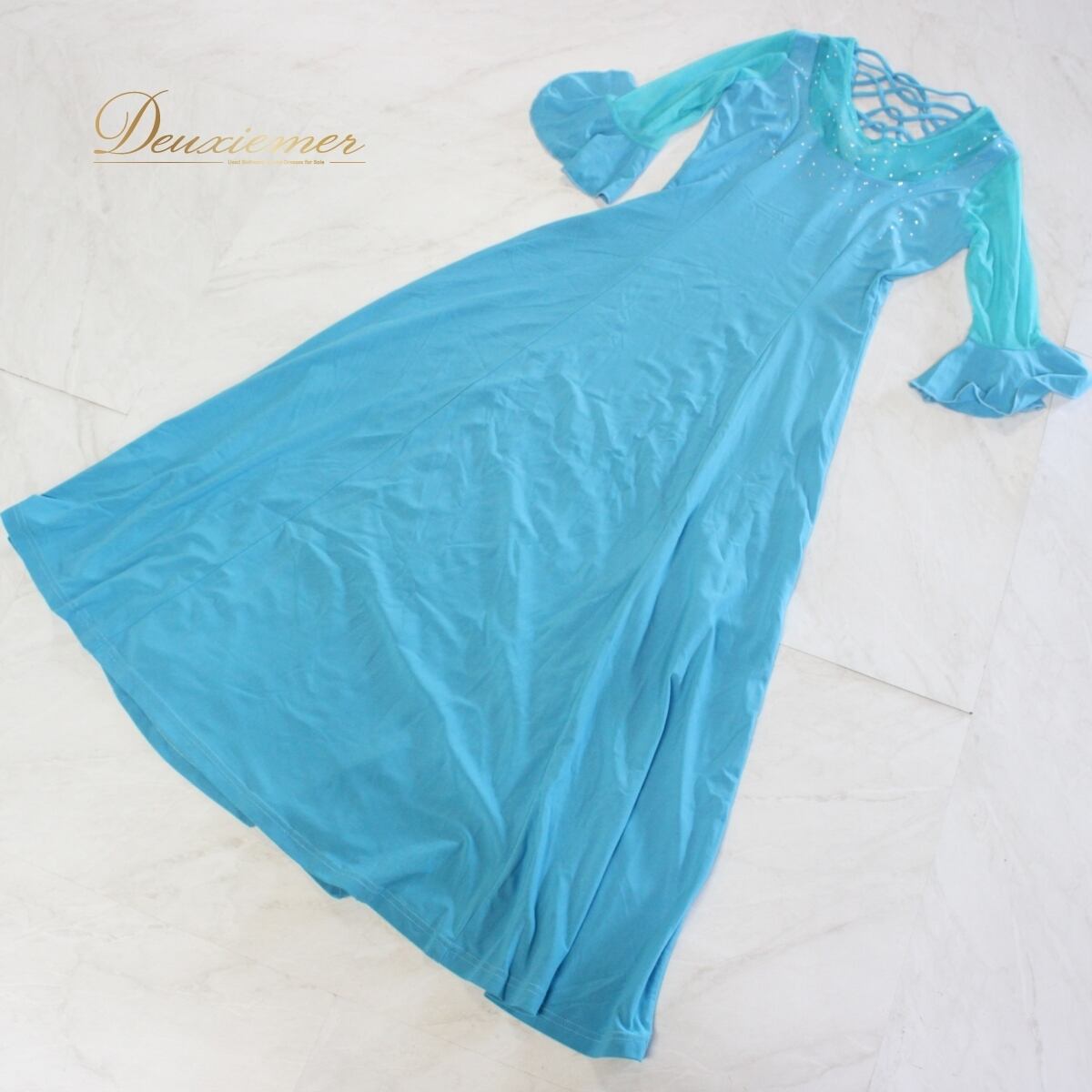 【美品 社交ダンス衣装】ワンピース ドレス ICHIOKU イチオク 水色 ライトブルー ラインストーン 透け感 レース かわいい