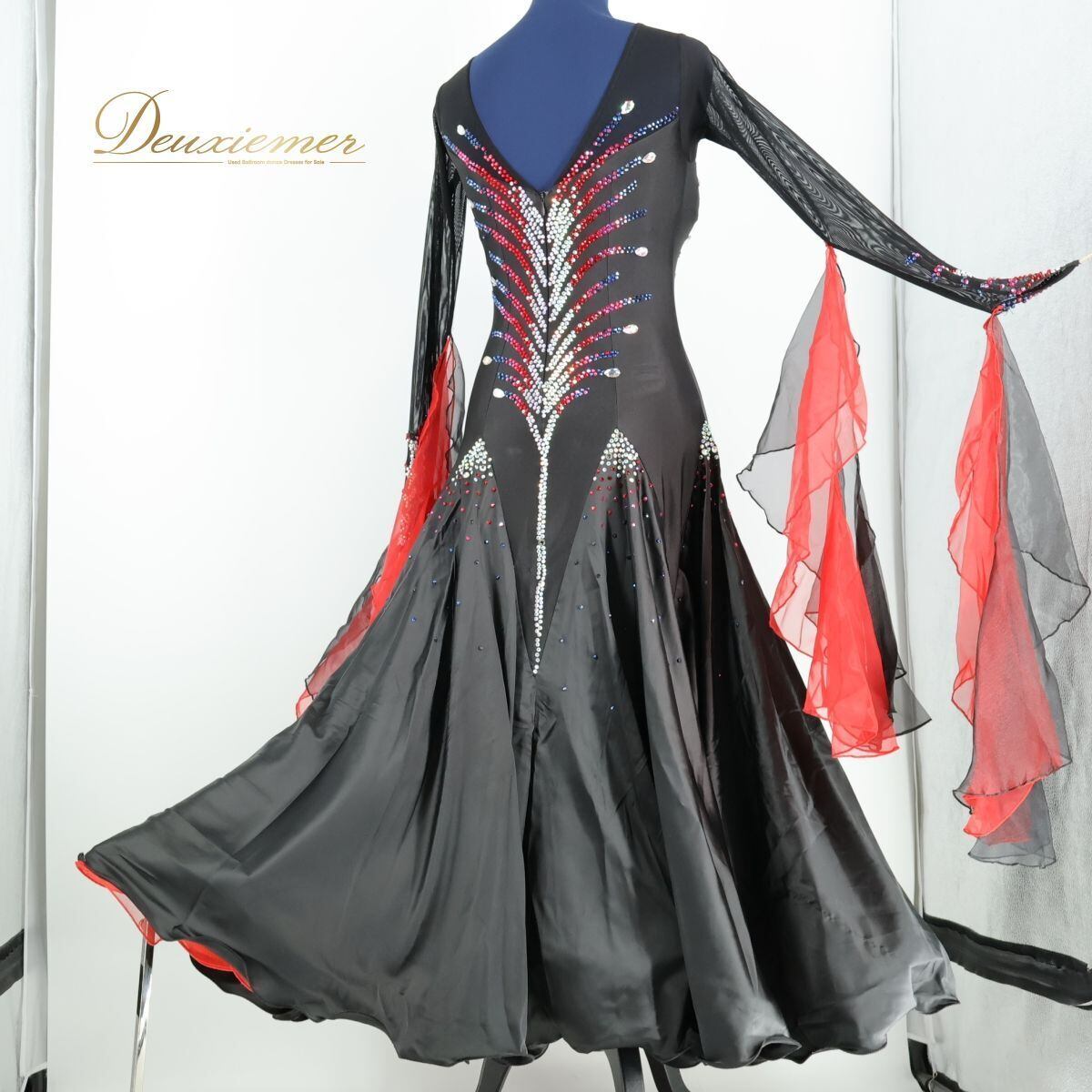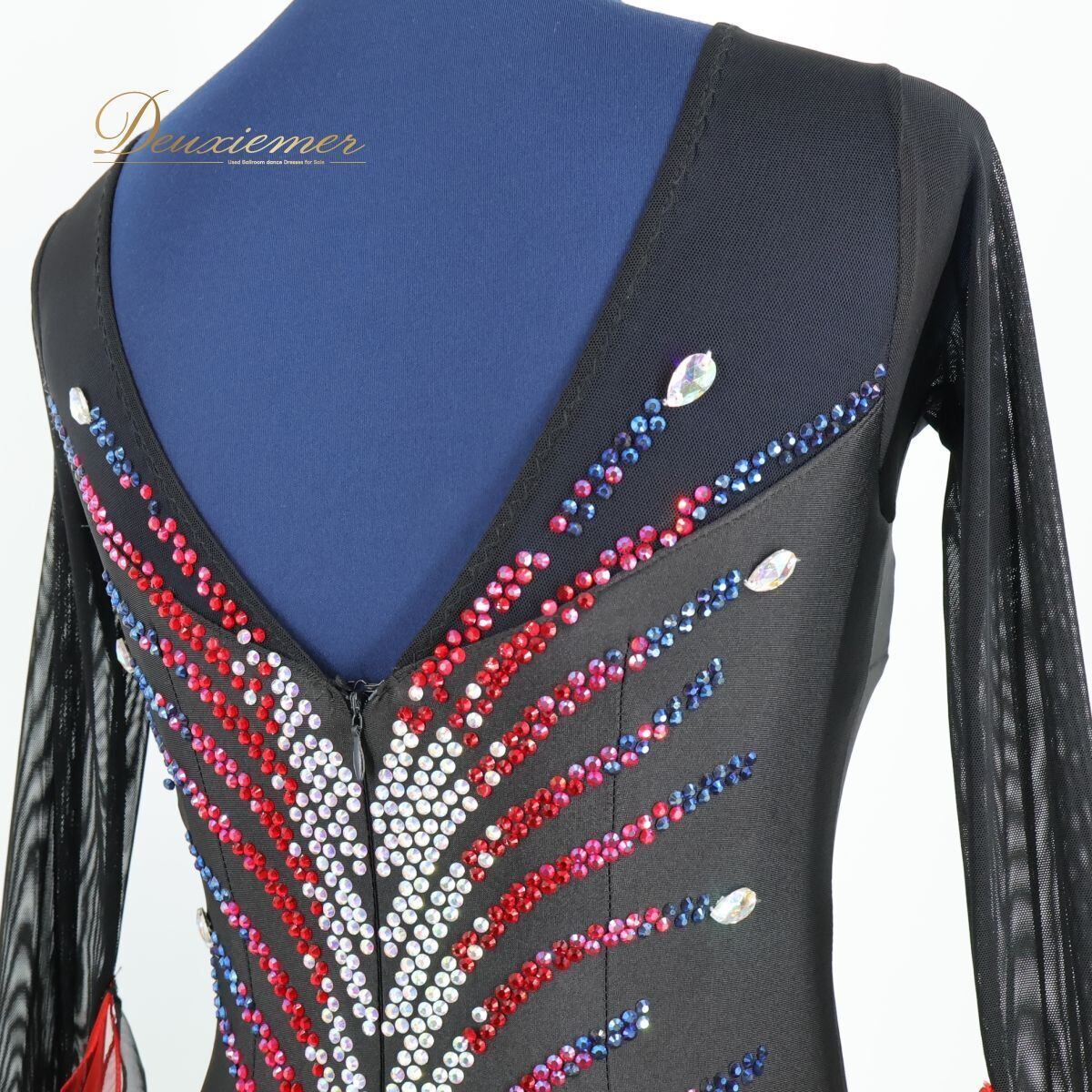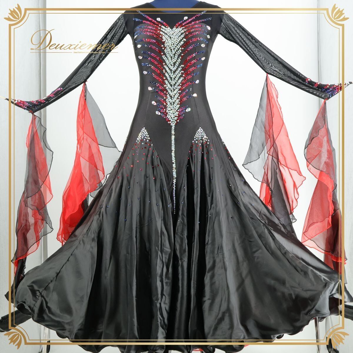 【社交ダンス衣装】ブラック ワンピース ドレス 黒 赤 レッド デモ 競技用 ダンス用 クロッチ フロート レース フリル 石