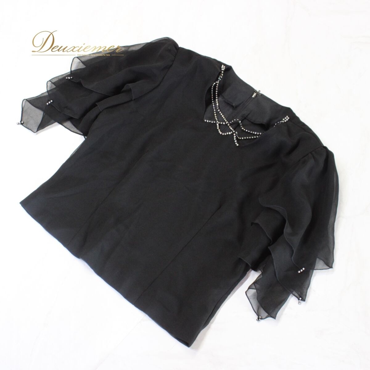 【美品 日本製社交ダンス衣装】トップス Sanline サンリーヌ Mサイズ 黒 ブラック ラインストーン 半袖 透け感 かわいい 上品