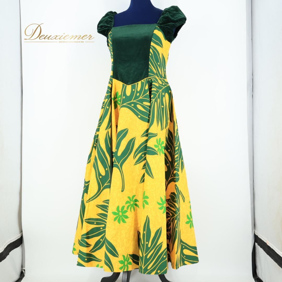 【日本製 フラダンス衣装】イエロー ALOHA STANDARDS アロハスタンダード ワンピース ドレス 黄 緑 葉っぱ柄 明るい グリーン