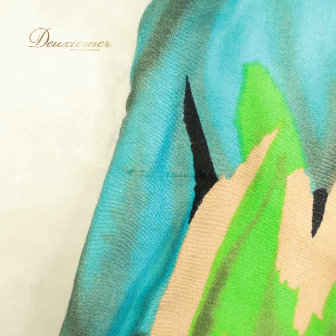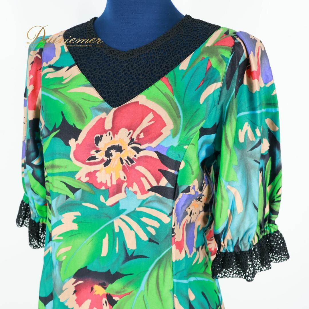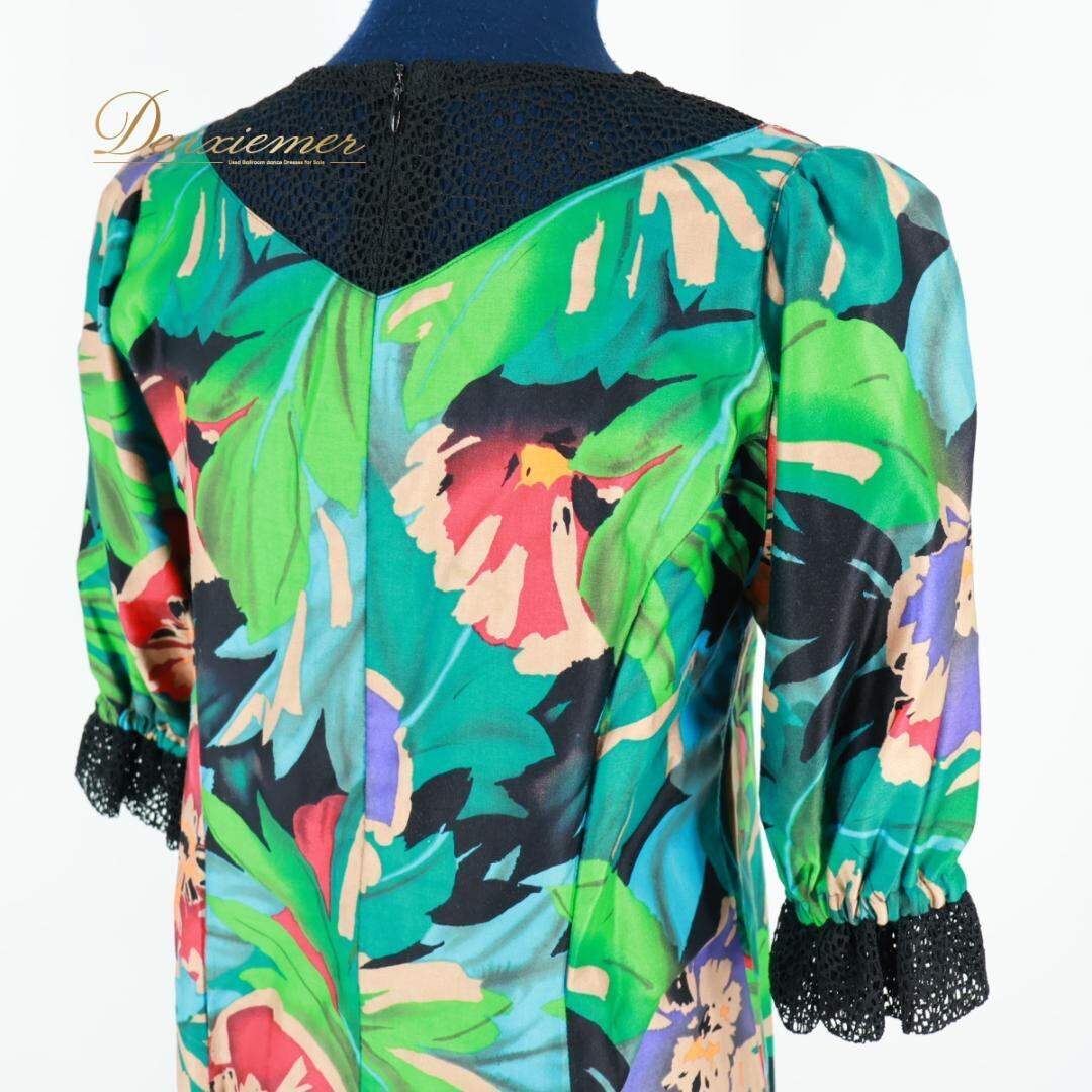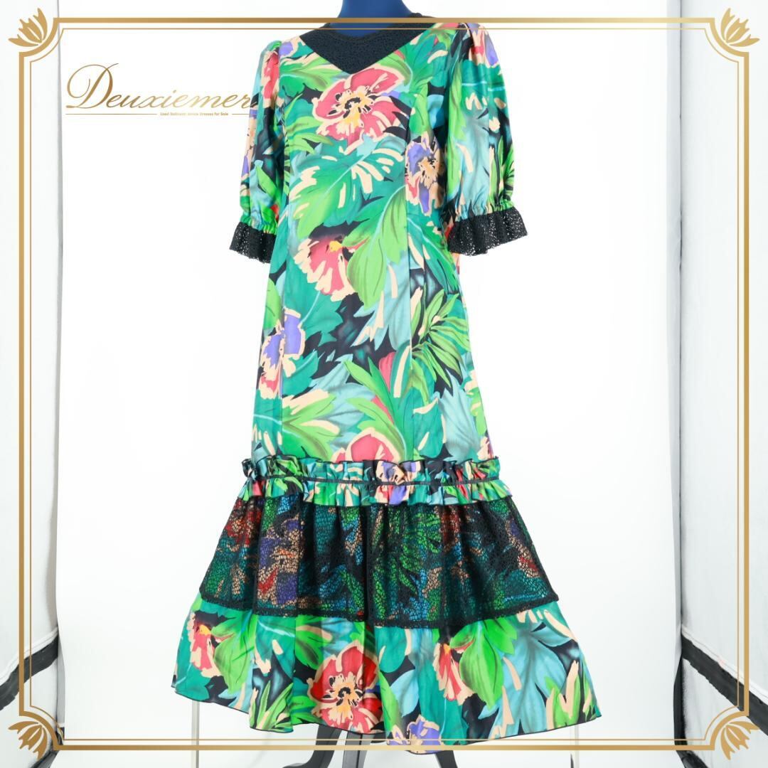 【美品 日本製 フラダンス衣装】グリーン NIKOH ワンピース ドレス 緑 黒 赤 水色 花柄 レース 鮮やか 華やか レッド ブラック