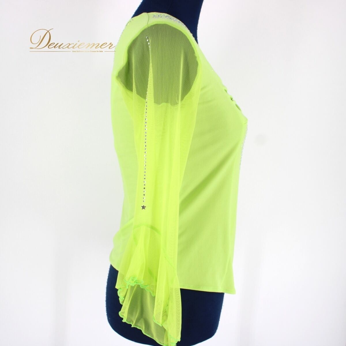 【美品 社交ダンス衣装】トップス レッスンウェア 練習着 黄緑 ライトグリーン ラインストーン 長袖 レース 透け感 かわいい