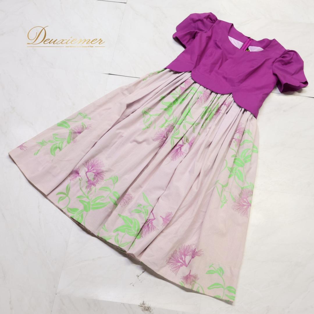 【フラダンス衣装】パープル Minei ワンピース ドレス 紫 白 緑 レフア柄 花柄 ストライプ 半袖 明るい 爽やか アロハ 可愛い