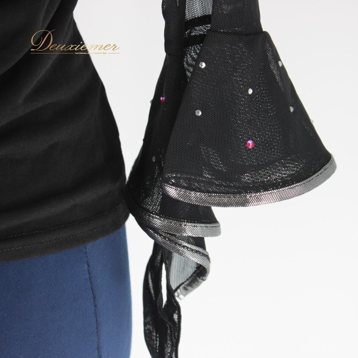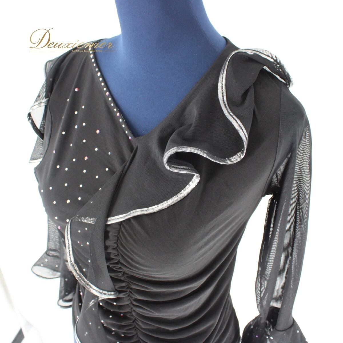【美品 社交ダンス衣装】トップス レッスンウェア 練習着 黒 ブラック レース 銀 シルバー ラインストーン 透け感 長袖 フリル
