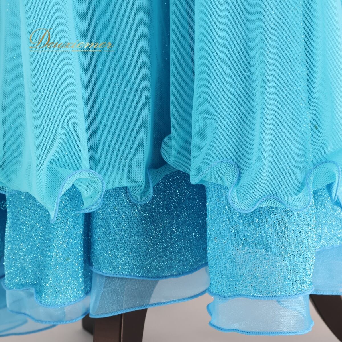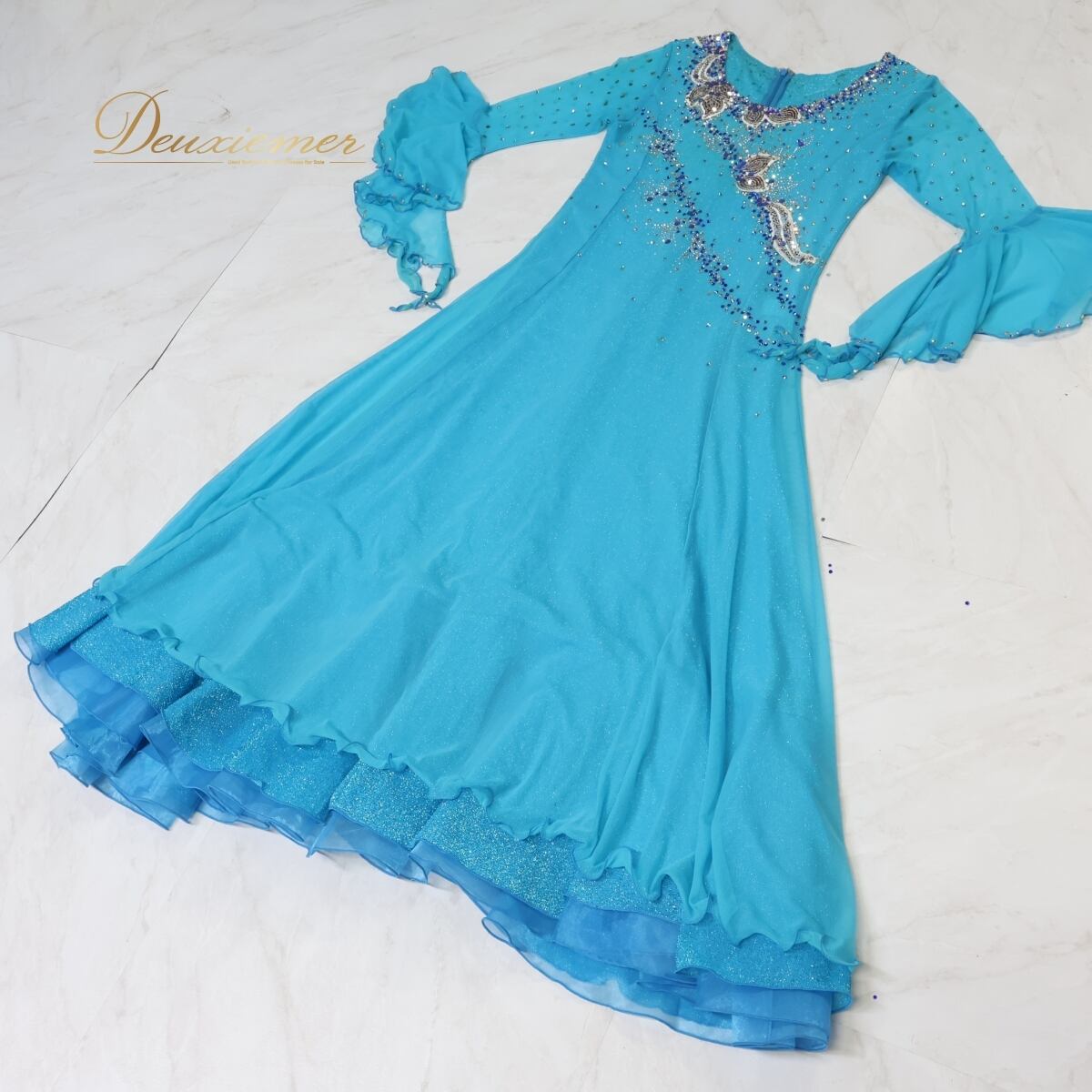 【社交ダンス衣装】ブルー prima boutique プリマブティック ワンピース ドレス 水色 青 フリル レース ラメ パーティ 発表会