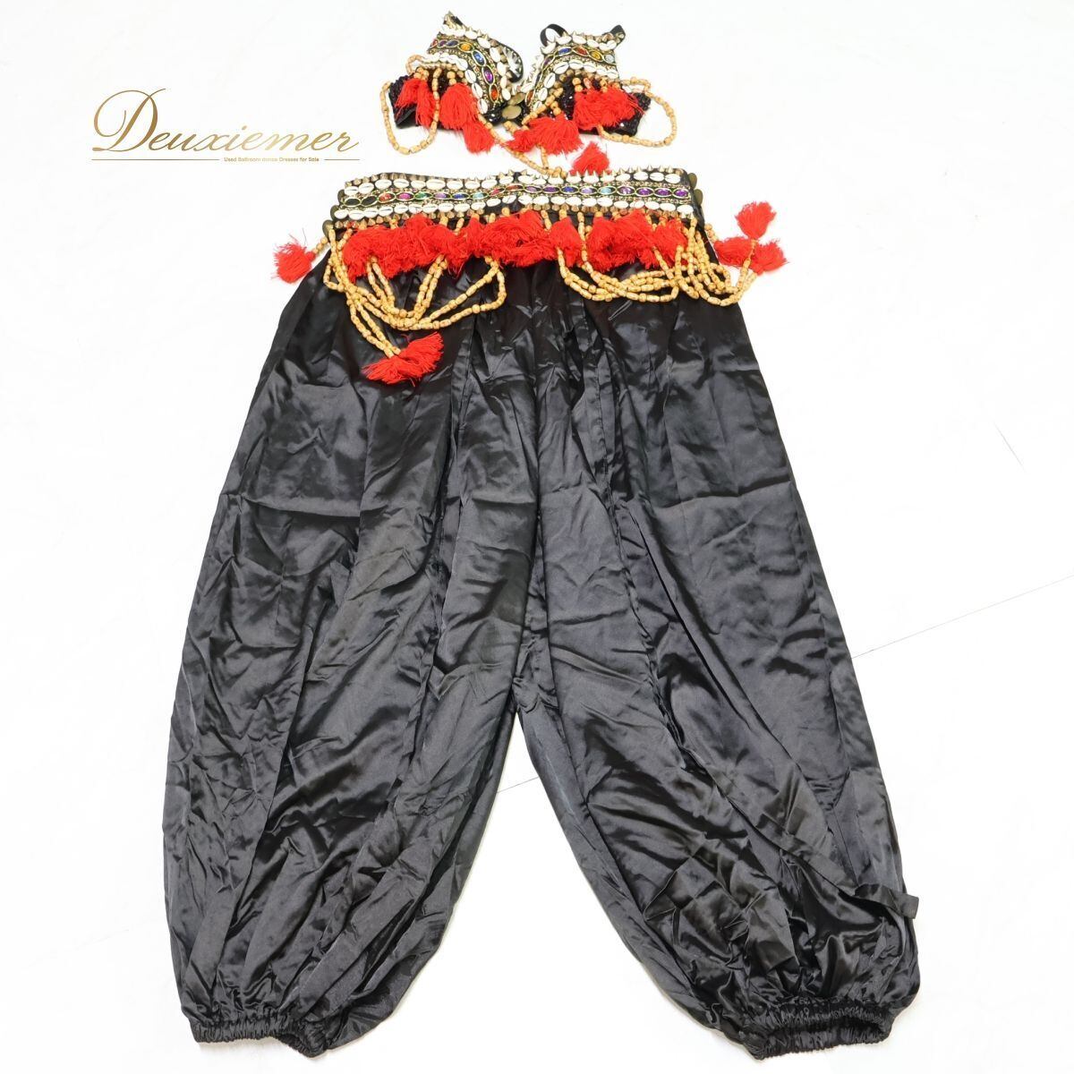 【ベリーダンス用 トライバル衣装】ブラック Qiaoshi 貝殻 スパンコールラメ 黒 赤 上下セット 3点セット 装飾豪華 ビーズ