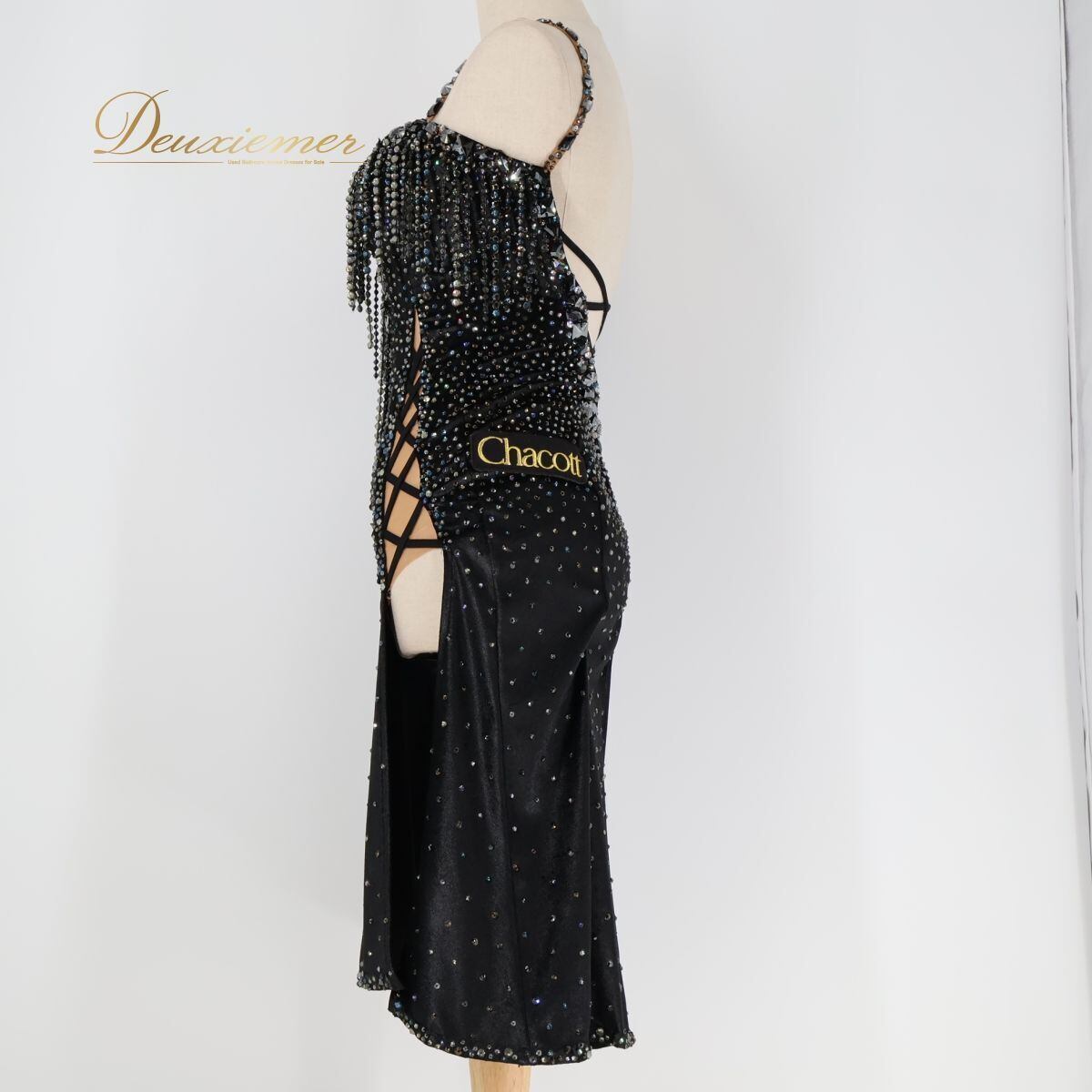 【日本製 社交ダンス衣装】ブラック Chacott チャコット ラテン ドレス ワンピース 黒 高級感 上品 デモ 競技用 編み上げ 小物