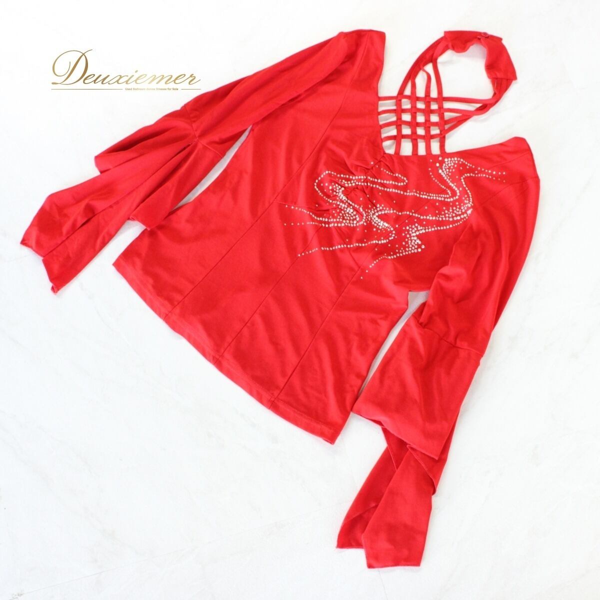 【美品 社交ダンス衣装】トップス レッスンウェア 練習着 ICHIOKU イチオク 赤 レッド ラインストーン 長袖 かわいい 派手