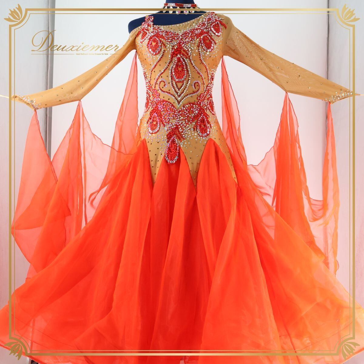 #社交ダンス #ダンス衣装 #ワンピース #ドレス #フリル #朱色 #レオタード #フォーマル #ダンスパフォーマンス #ファッション #衣装 #ダンス #イベント #パーティー #ダンススタイル #美しい #特別な日 #プロム #舞台衣装 #ENUTSU