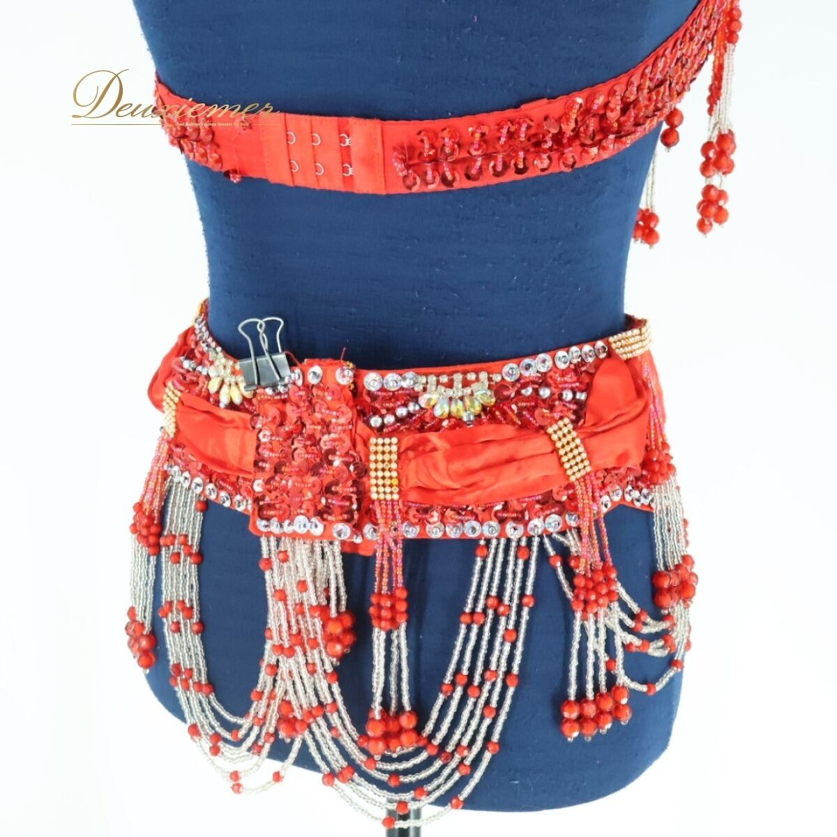 【ベリーダンス用 オリエンタル衣装】レッド ラメ ビーズ 多数付き 赤 シルバー セット 煌びやか 可愛い お洒落 鮮やか