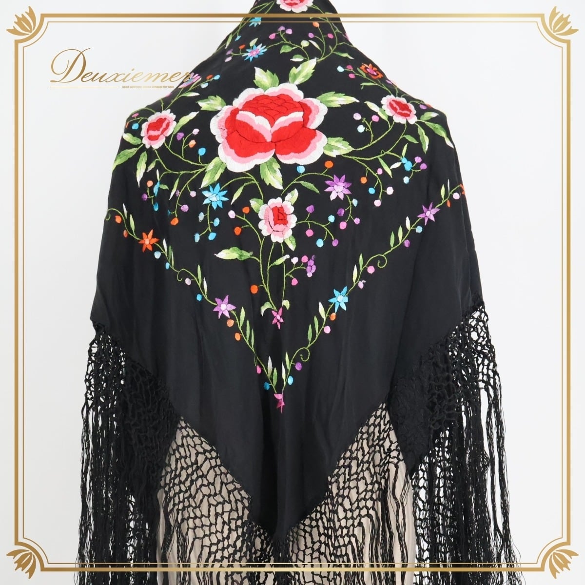 【フラメンコ衣装】ブラック マントン シージョ 黒 刺繍 フレコ フリンジ ダンス用 花柄 軽い 薄い トライアングル 三角形