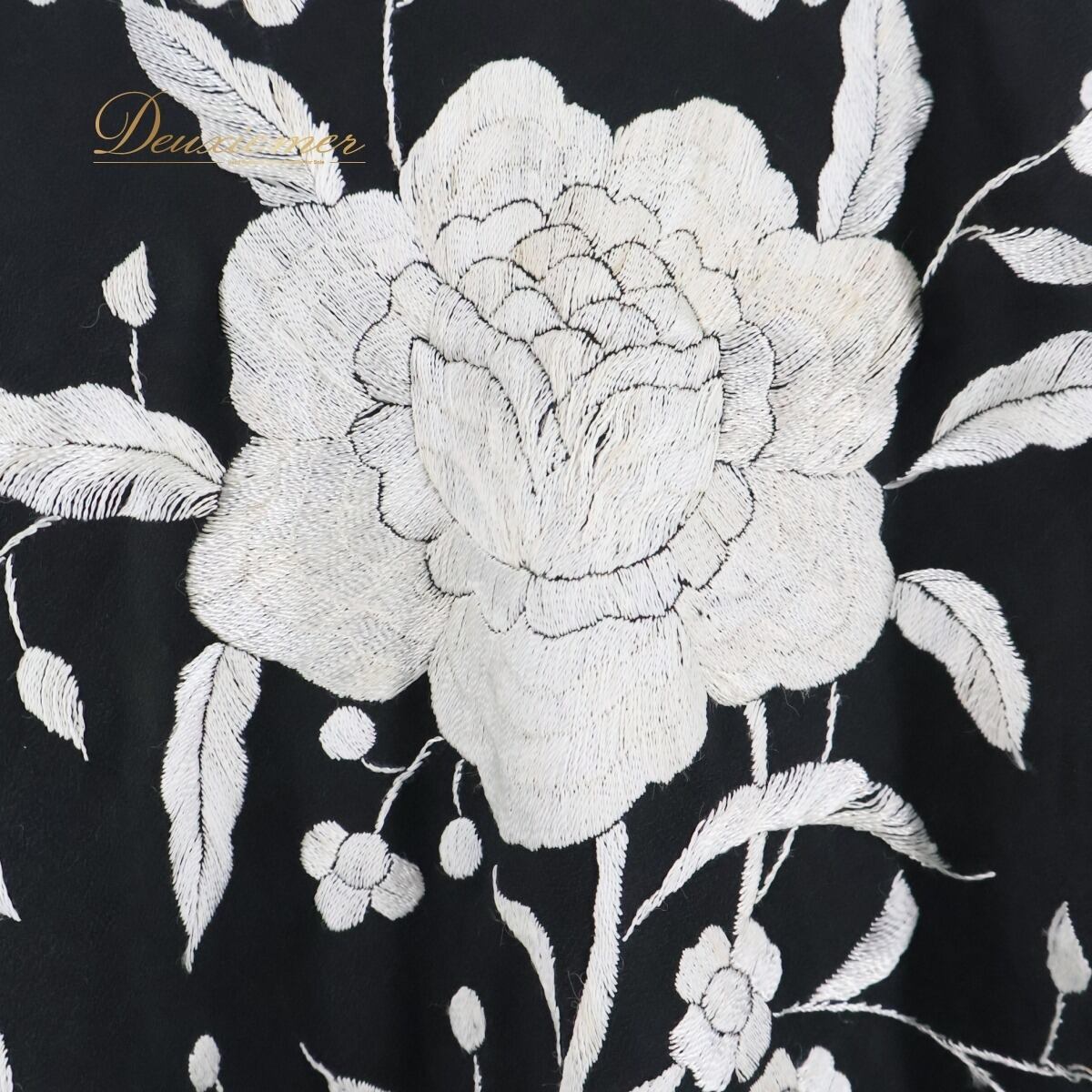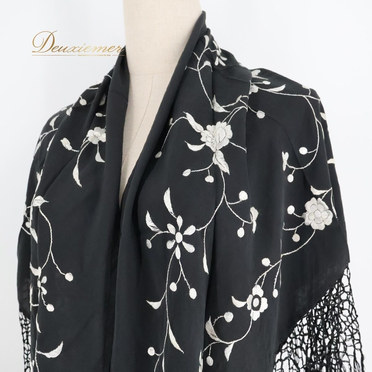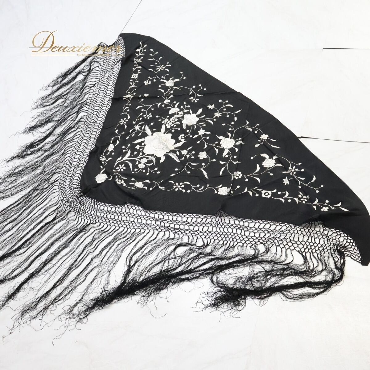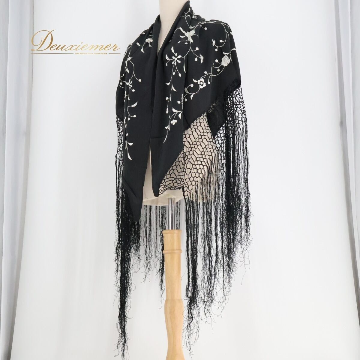 【フラメンコ衣装】ブラック マントン シージョ フレコ 黒 シルバー 刺繍 トライアングル 三角形 フリンジ 軽い 薄い 花柄