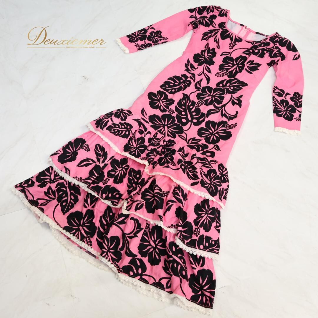 【フラダンス衣装】ピンク ワンピース ドレス 黒 ハイビスカス柄 モンステラ柄 ブラック 鮮やか フリル アロハ 長袖 かわいい