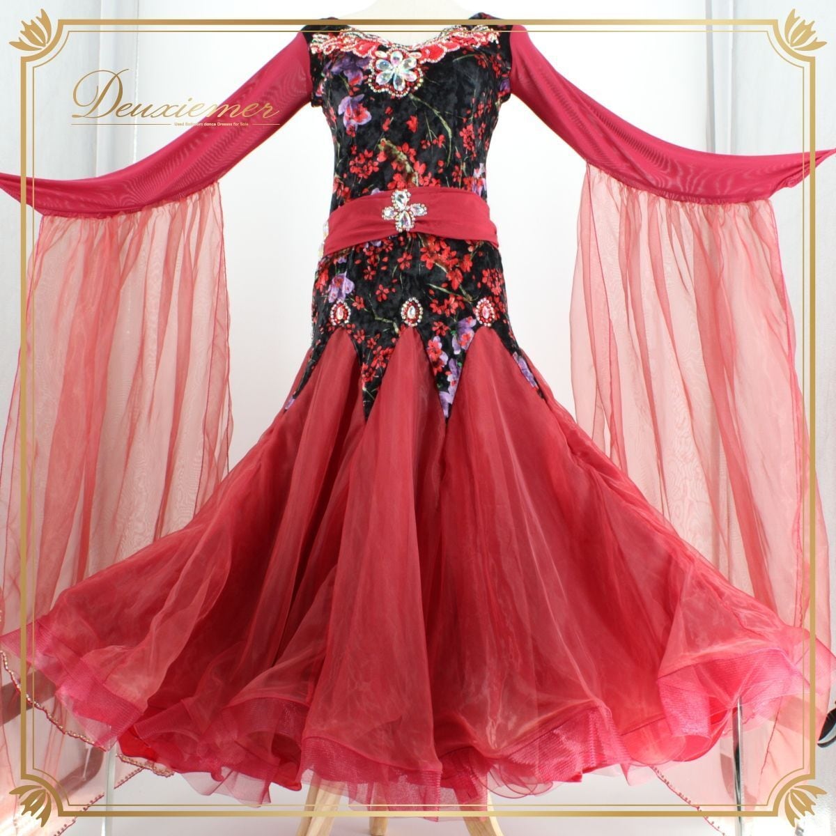 【社交ダンス衣装】レッド ワンピース ドレス 赤 フリル レース フロート ベロア ダンス 花柄 軽い レディース 長袖 上品
