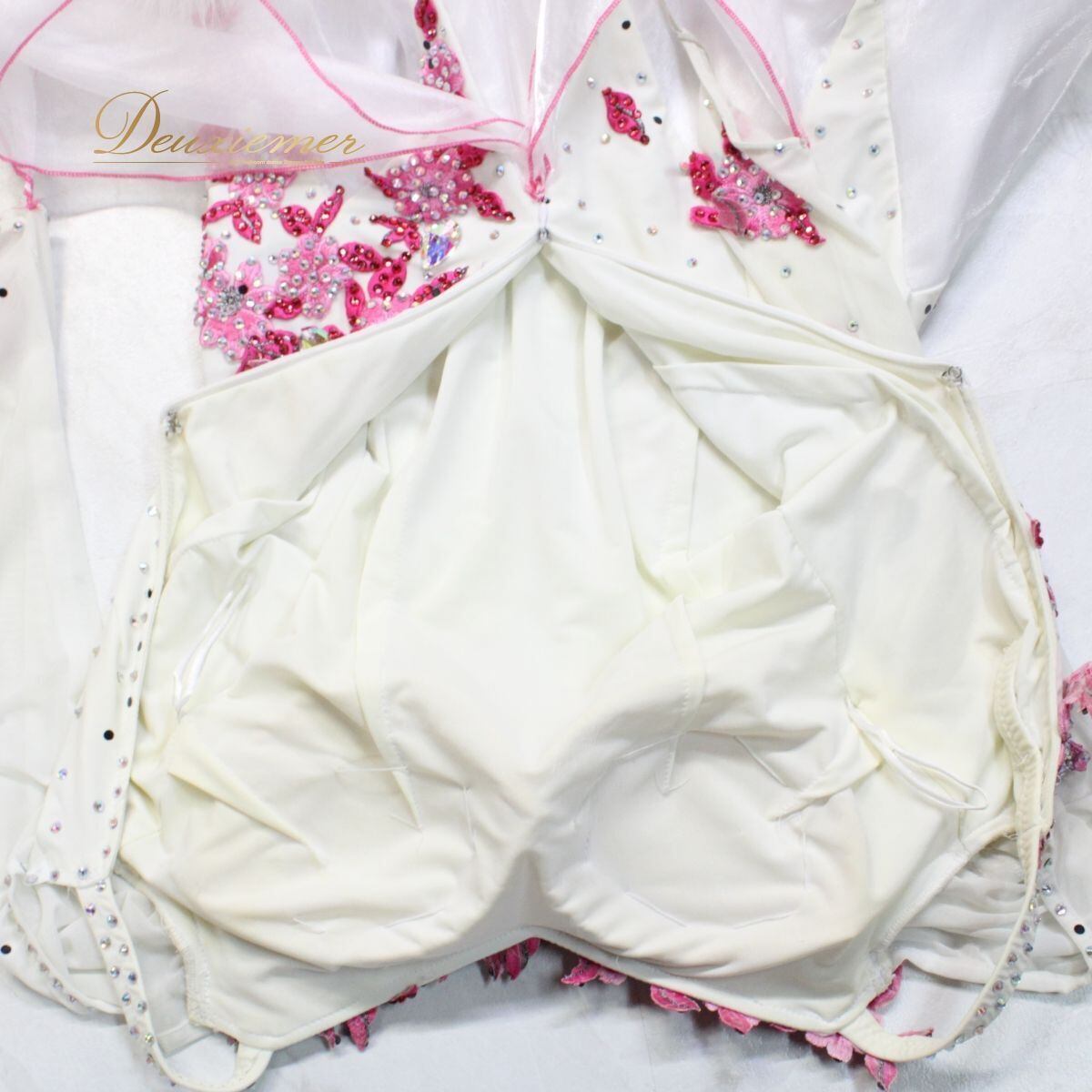 【社交ダンス衣装】ホワイト ワンピース ドレス 白 ピンク 羽 ファー フリル レース デモ 競技用 フロート パーティ ダンス