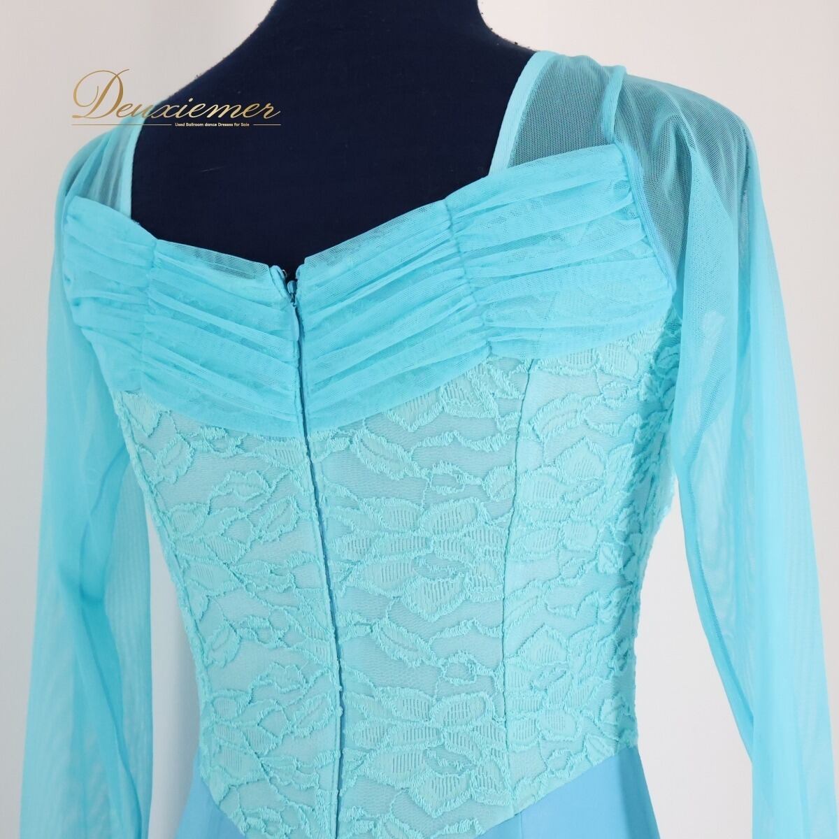【日本製 社交ダンス衣装】ブルー Sanline サンリーヌ ワンピース ドレス 水色 フリル レース パーティ 無地 長袖 ダンス