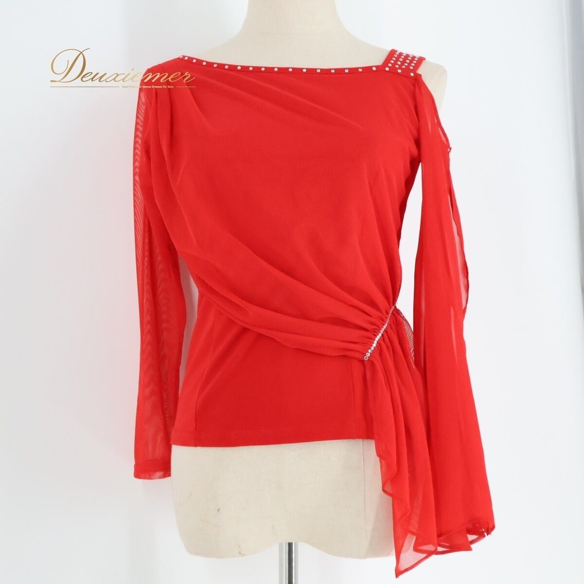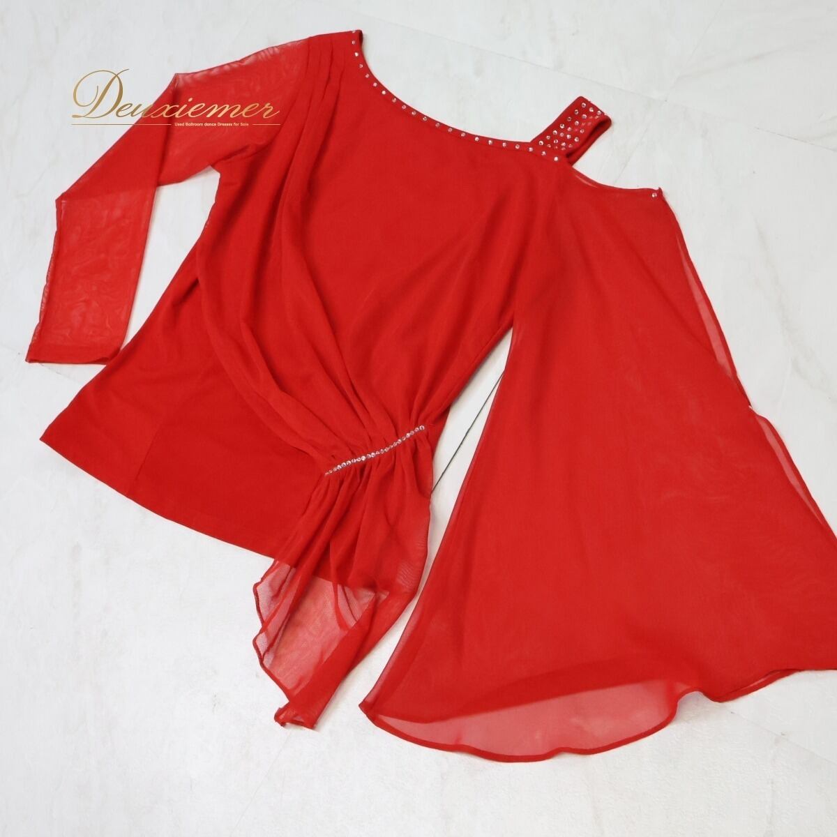 【美品 社交ダンス衣装】レッド create-sun クリエイトサン ブラウス トップス 赤 無地 レース 軽い 伸縮 おしゃれ レッスン