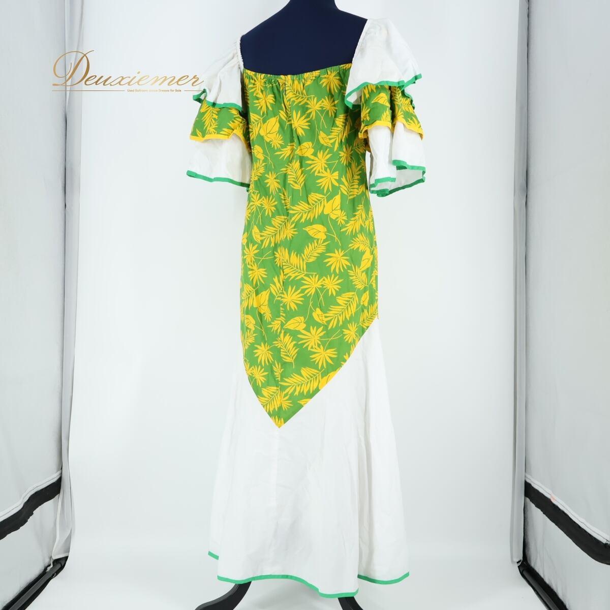 【フラダンス衣装】ホワイト ワンピース ドレス 白 黄緑 黄 葉っぱ柄 フリル ふんわり 明るい イエロー ライトグリーン 可愛い