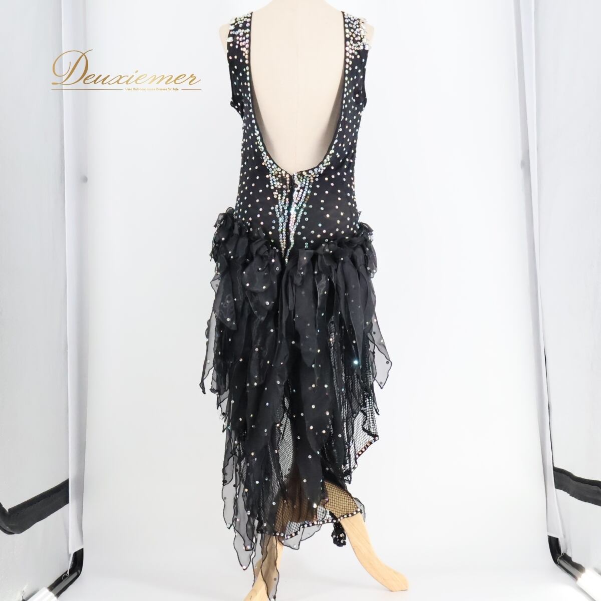 【社交ダンス衣装】ブラック ラテン ドレス 黒 フリル レース 高級感 上品 ダンス用 クロッチ 丈違い デモ 競技用 レディース 前後丈違いおしゃれ 伸縮性 ステージ