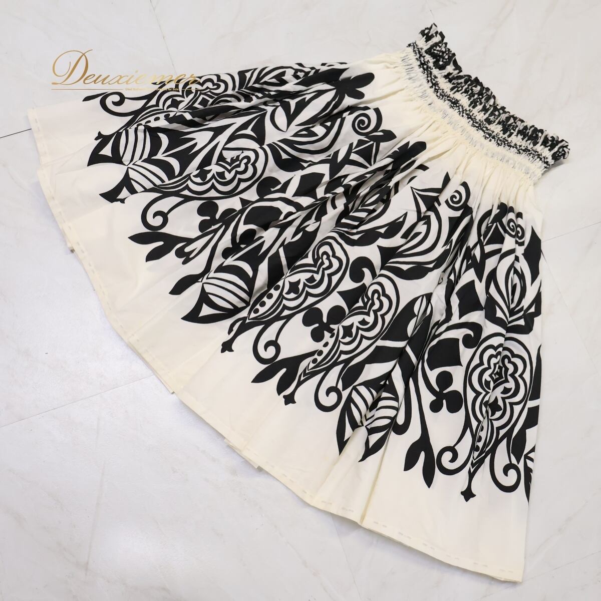 #フラダンス #パウスカート #ホワイトコーデ #ブラックアクセント #白黒スカート #明るい色合い #爽やかスタイル #ハワイアンプリント #アロハファッション #かわいいスカート #ふんわりシルエット #ゴム仕様 #南国コーデ #ステージ映え #リゾートスタイル #ナチュラルかわいい #舞台衣装 #夏スタイル #ダンス衣装 #ダンスコスチューム #ステージ衣装 #古着 #中古 #ENUTSU