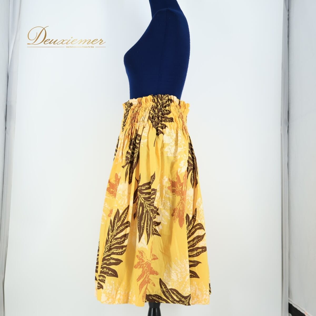 【フラダンス衣装】イエロー パウスカート 黄 茶 白 葉っぱ柄 明るい ブラウン ホワイト ハワイアン アロハ ふんわり かわいい