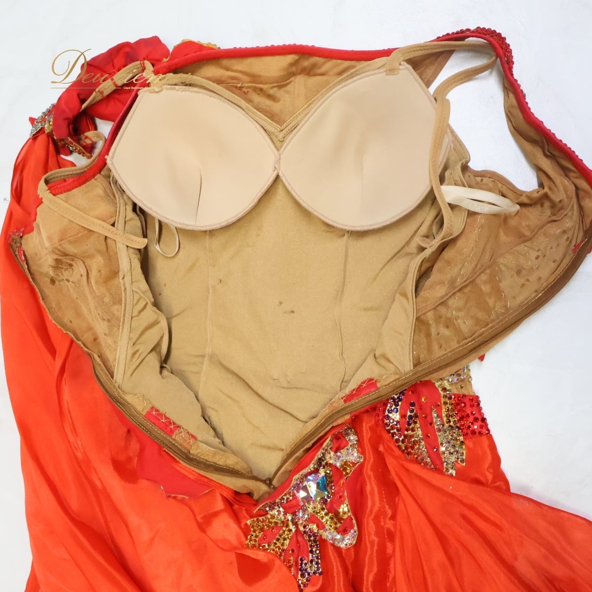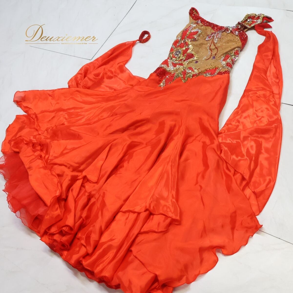 #社交ダンス #ダンスウェア #ダンスドレス #ワンピース #Chacott #チャコット #日本製 #朱色 #レッド #競技用 #フロア #ファスナー #レオタード #伸縮性 #胸パッド #ドレスアップ #ダンス衣装 #豪華 #シルエット #ENUTSU
