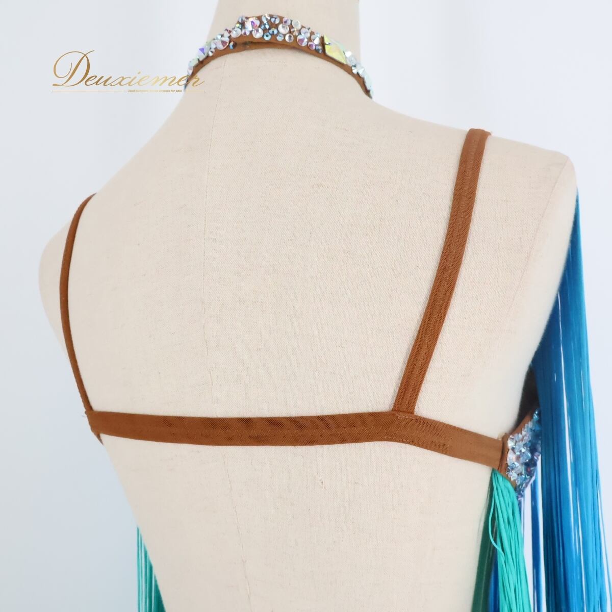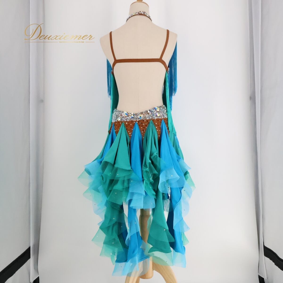 【社交ダンス衣装】ブルー Chacott チャコット ラテン ドレス ワンピース 水色 緑 フリル フリンジ デモ 競技用 小物 高級感 豪華 コスチューム