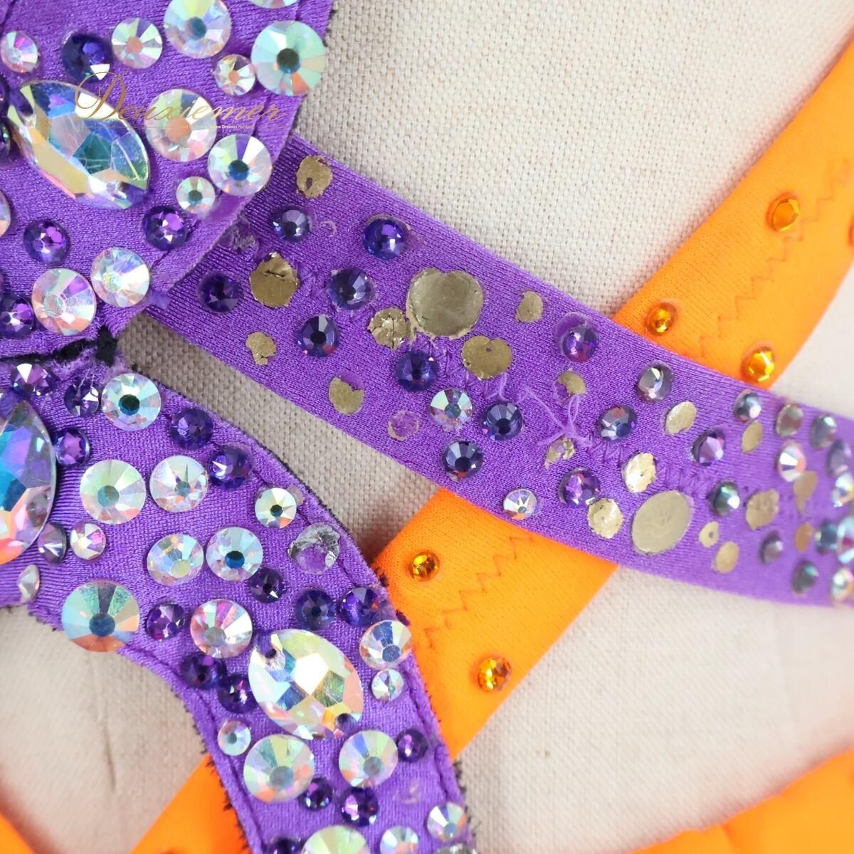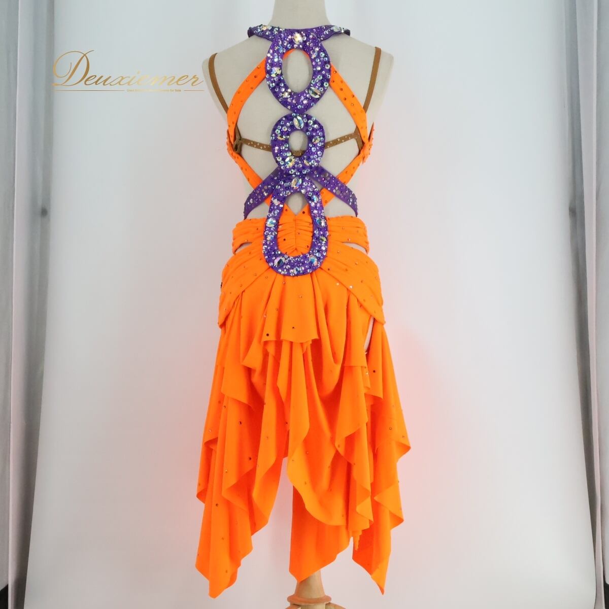 【日本製 社交ダンス衣装】オレンジ Chacott チャコット ラテン ドレス ワンピース 蛍光 紫 パープル レース デモ 競技用 豪華 スカート ヒダ おしゃれ
