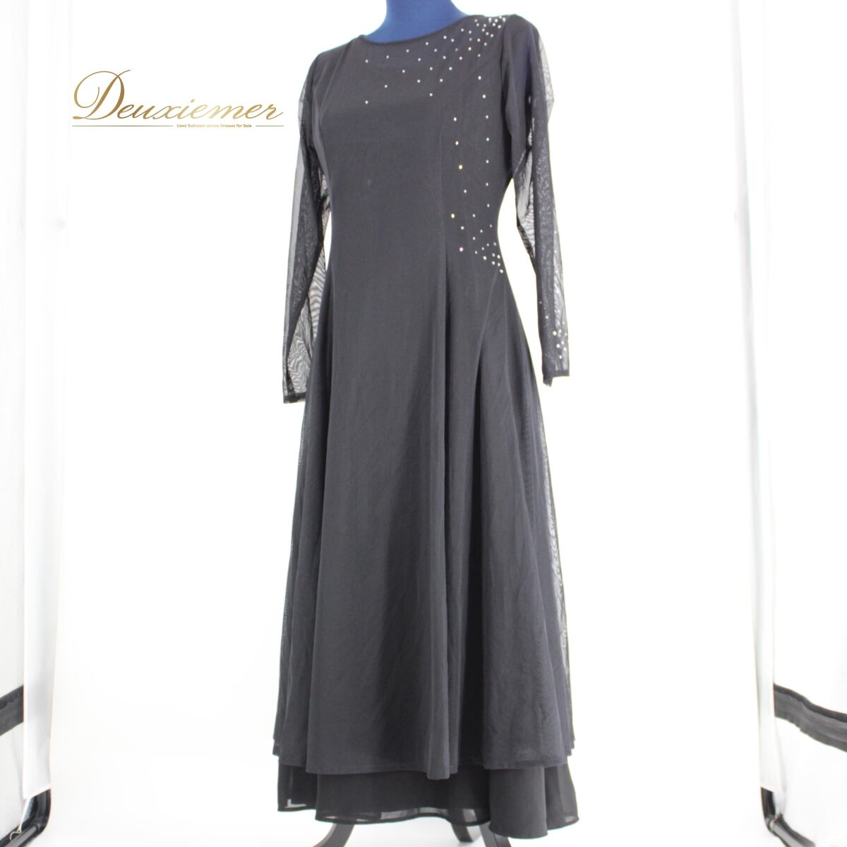 【社交ダンス衣装】ワンピース ドレス ツーピース 11号 maie 黒 ブラック ラインストーン 透け感 長袖 袖なし しんぷる 上品