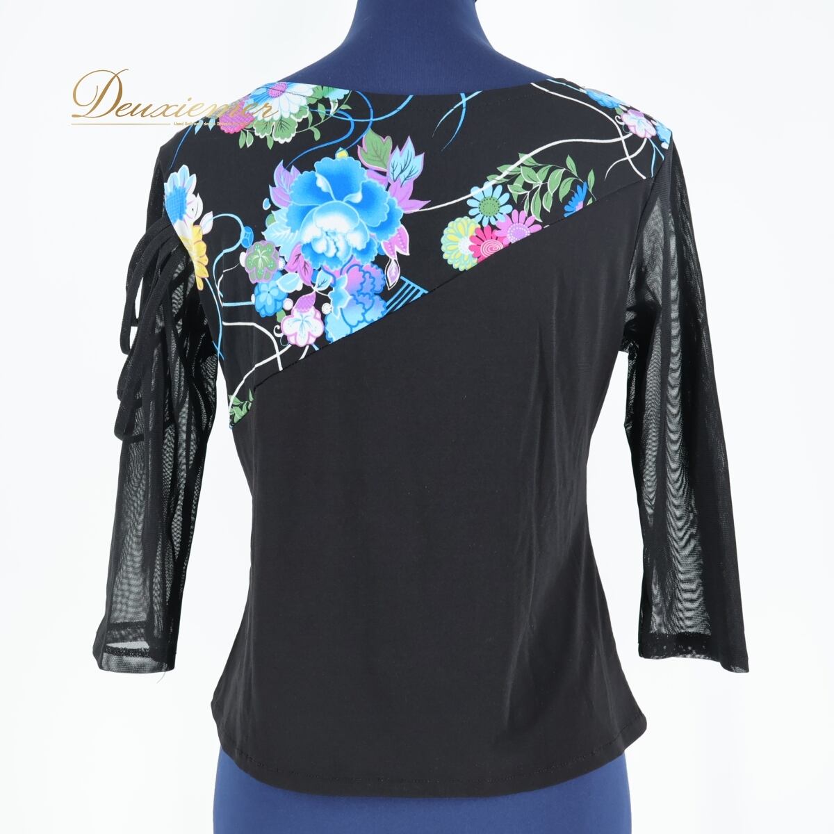 #社交ダンス #ダンストップス #プリマブティック #primaboutique #ブラックトップス #花柄デザイン #カラフルコーデ #透け感ブラウス #上品スタイル #黒トップス #青アクセント #黄アクセント #白アクセント #練習着 #レッスンウェア #美品アイテム #大人かわいい #ダンス衣装 #ダンスコスチューム #ステージ衣装 #古着 #中古 #ENUTSU