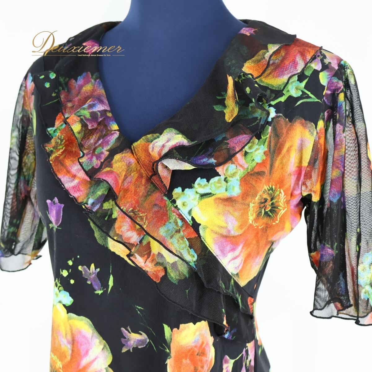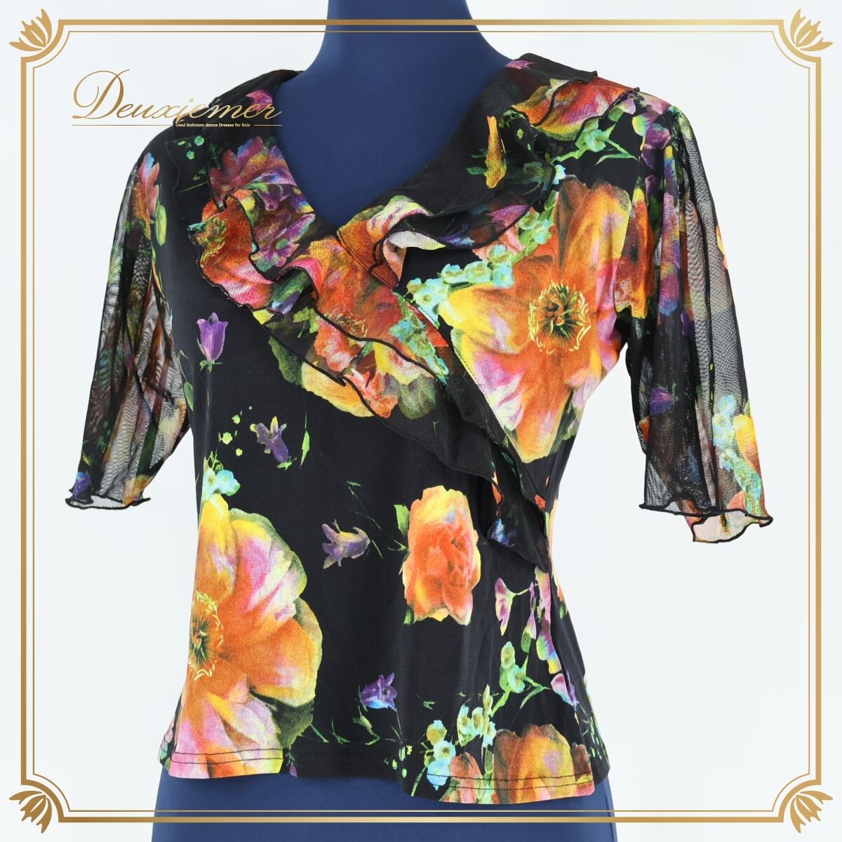 #社交ダンス #ダンストップス #ブラックトップス #花柄デザイン #カラフルフラワー #透け感スリーブ #フリル袖 #オレンジアクセント #イエローアクセント #ブルーアクセント #上品スタイル #華やかトップス #練習着 #レッスンウェア #美品アイテム #大人かわいい #ストレッチ素材 #エレガントファッション #ダンス衣装 #ダンスコスチューム #ステージ衣装 #古着 #中古 #ENUTSU
