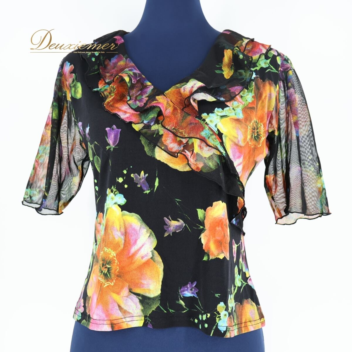 【美品 社交ダンス衣装】ブラック トップス ブラウス 黒 オレンジ 黄 青 花柄 透け感 華やか レッスン 練習着 フリル かわいい
