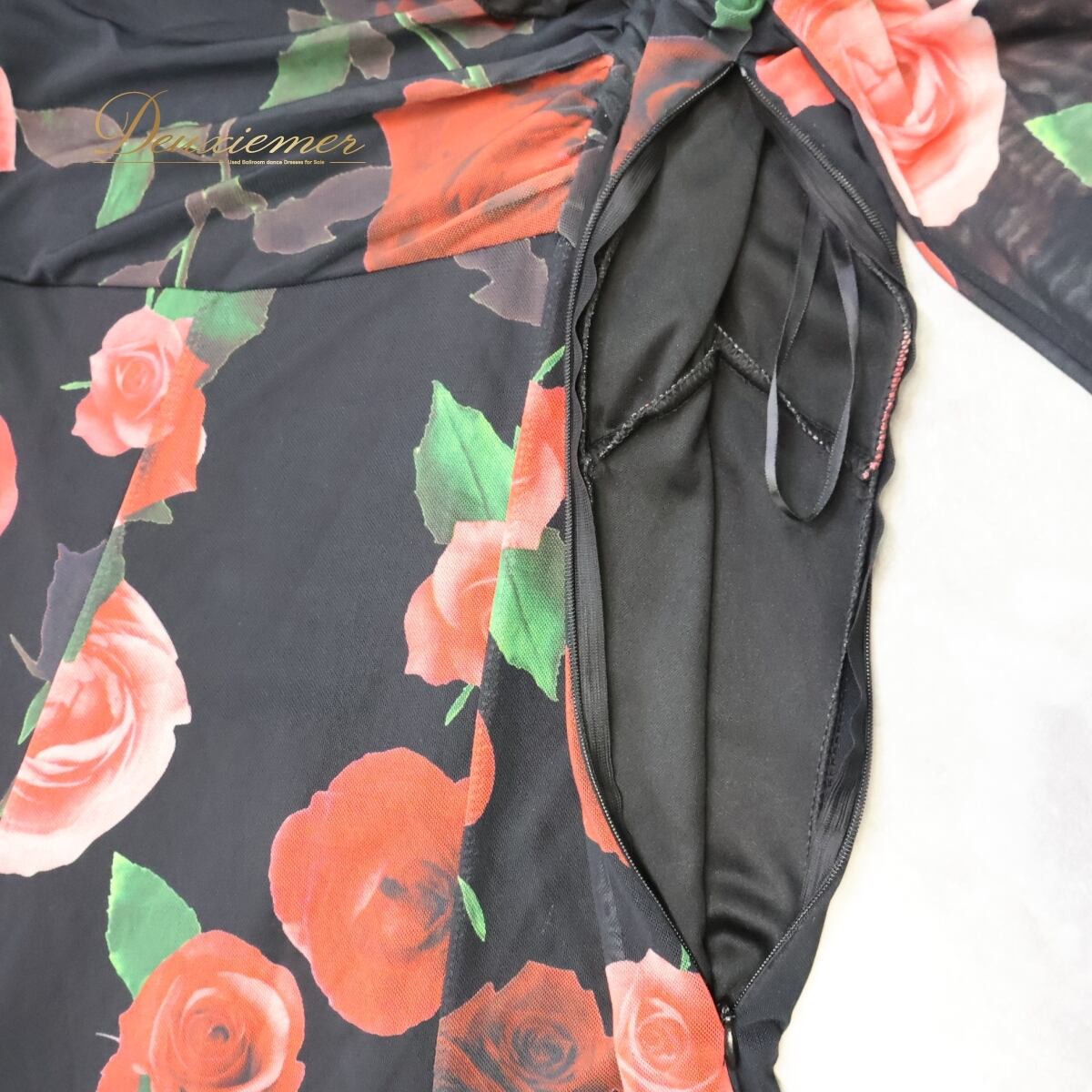 【社交ダンス衣装】ブラック レッド ワンピース ドレス 黒 赤 花柄 レッスン レース生地 フリル 華やか 女性らしい かわいい