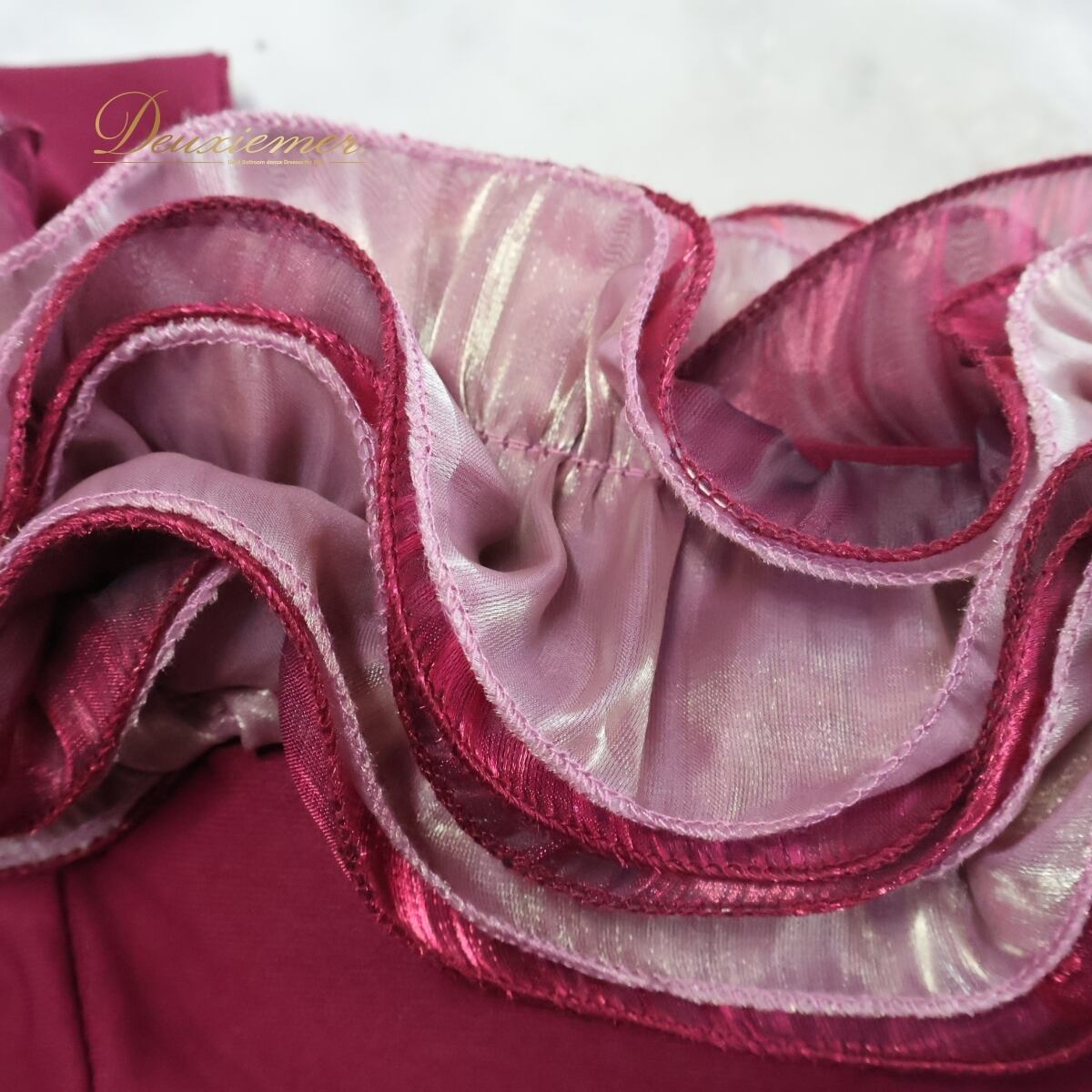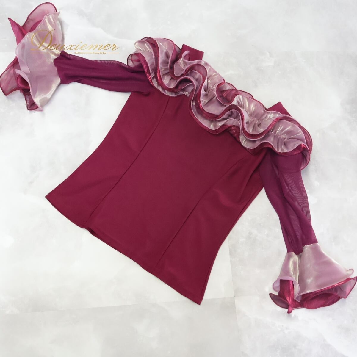 【社交ダンス衣装】ワインレッド ピンク ICHIOKU トップス スカート 上下セット レッスン着 赤紫 フリル 豪華 かわいい 華やか