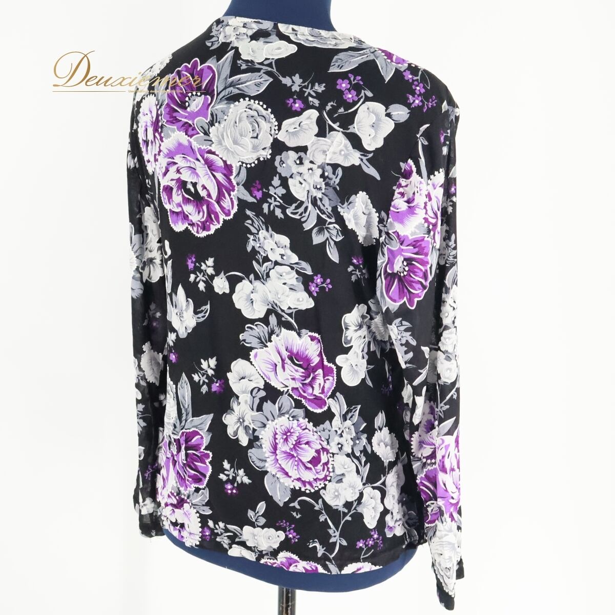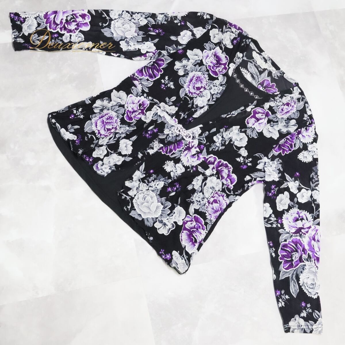 #社交ダンス #社交ダンス衣装 #ダンストップス #ブラウス #ブラックトップス #黒コーデ #紫アクセント #白アクセント #花柄デザイン #ラインストーン付き #ラメ入り #レース生地 #練習着 #レッスンウェア #華やかスタイル #大人ダンス #ダンス衣装 #ダンスコスチューム #ステージ衣装 #古着 #中古 #ENUTSU