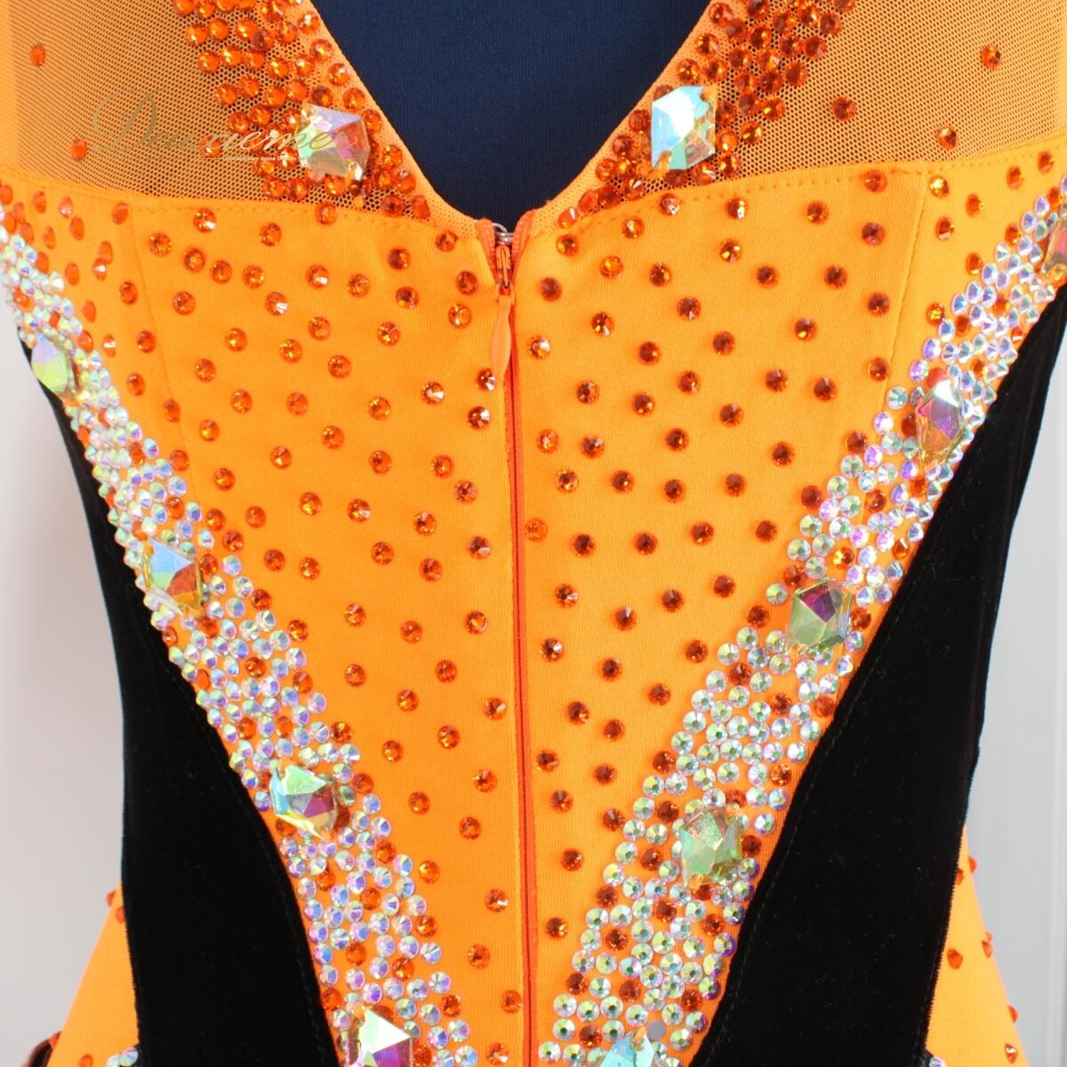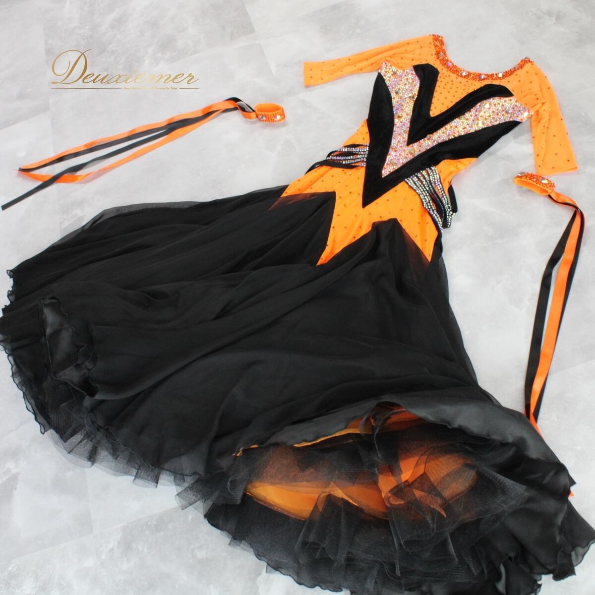 【社交ダンス衣装】オレンジ NANAKA ナナカ ワンピース ドレス 黒 ブラック デモ 競技用 フリル レース 蛍光 豪華 ボリューム