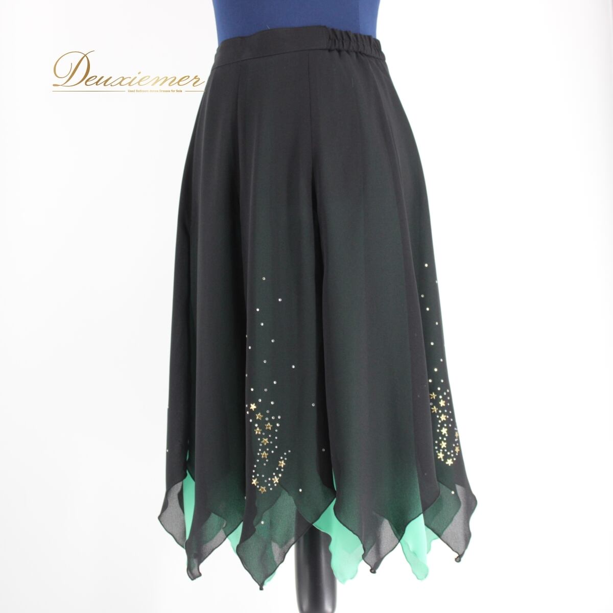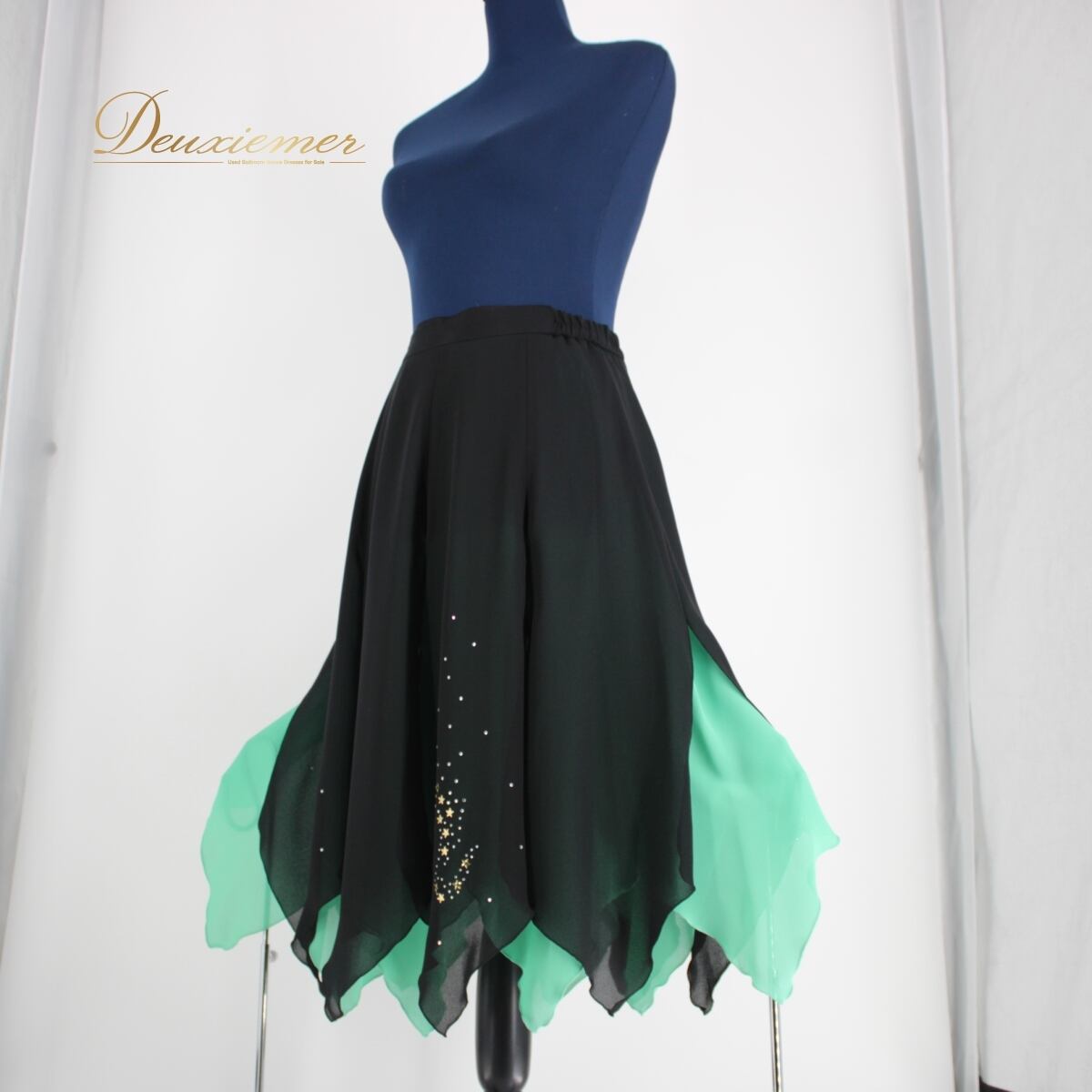 【美品 日本製社交ダンス衣装】スカート レッスン パーティー 黒 青緑 ブラック ミントグリーン バイカラー ラインストーン