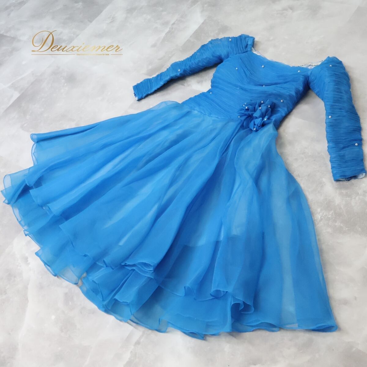 【パーティドレス】ブルー NOIR COMME JAIS ワンピース ドレス 青 軽い 発表会 演奏会 カラオケ パーティ 長袖 レース ダンス