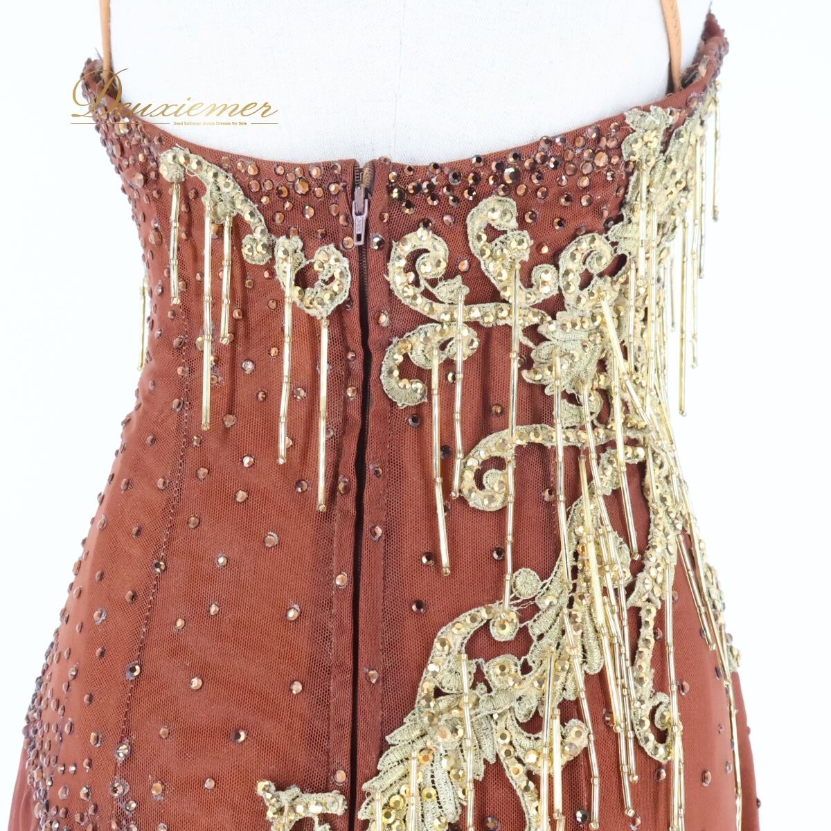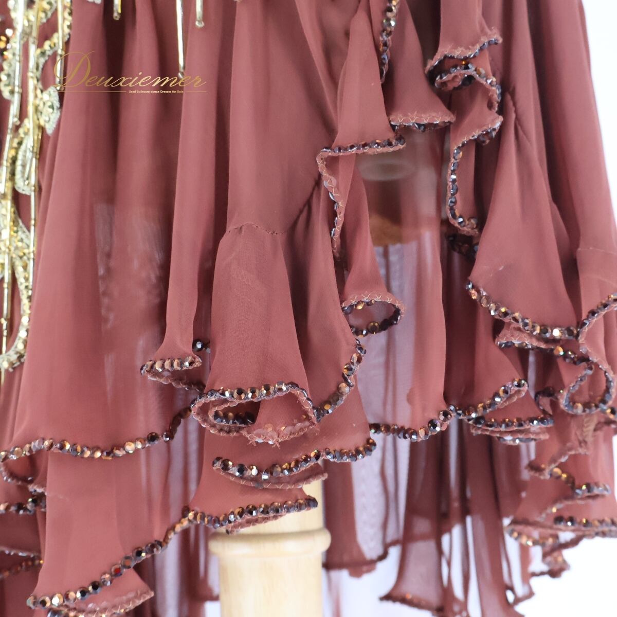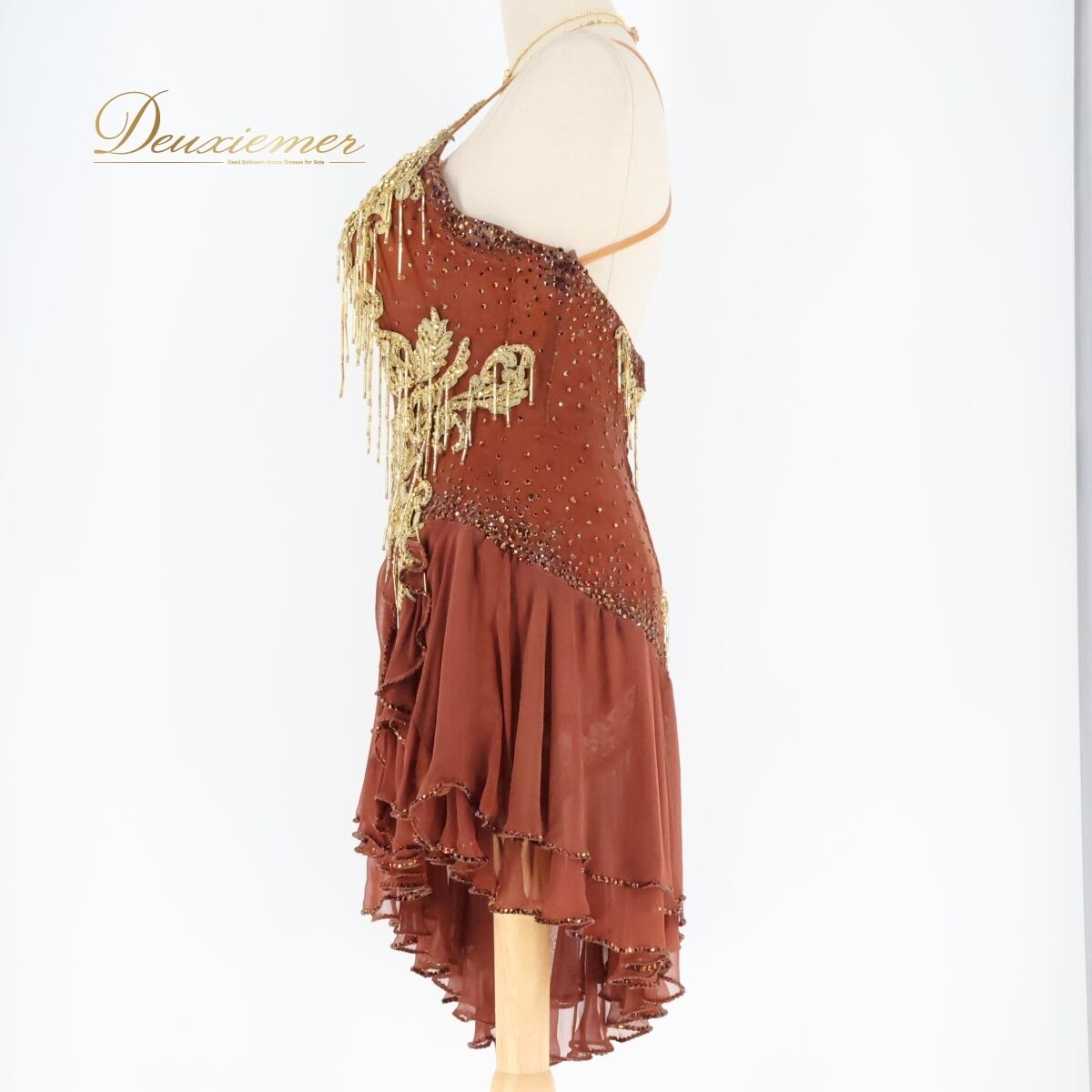 【社交ダンス衣装】ブラウン YANAGIDA ヤナギダ ラテン ドレス ワンピース 茶色 レース ゴールド ダンス デモ 競技用 装飾 高級感 濃い茶色 おしゃれ 揺れる装飾